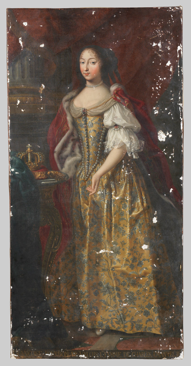 - NOTIZIE STORICO CRITICHE Il dipinto fa parte di un più ampio nucleo attualmente conservato presso il castello di Racconigi. La tela, uniforme per dimensioni alle altre della serie, raffigura Francesca Borbone di Valois prima moglie di Carlo Emanuele II. Il dipinto è registrato nel 1879 presso il castello di Moncalieri, al secondo piano, nel magazzino quadri, al numero S.M. 177. A differenza dei quadri che compongono la serie dinastica (da Beroldo, S.M. 28 a Elisabetta Maria di Angelo Capisani, S.M. 116) scaricati, secondo quanto si legge nel medesimo inventario nel 1920 presso il castello di Racconigi, questo ritratto, così come quelli di Bona di Berry (R 1503), Amedeo VII (R 1504) e di Filippo II (R 1501), viene scaricato a Racconigi il 12 marzo 1890, come documenta il medesimo inventario. Nella serie iconografica sabauda conservata nella Galleria n. 70 al primo piano del castello di Moncalieri (registrata anch'essa nell'inventario del 1879) non compare invece alcun dipinto con questo soggetto. L'opera può tuttavia essere messa in relazione con alcuni ritratti appartenenti a questa serie realizzati nell'ambito dell'allestimento di tale galleria alla fine del Settecento (P. Austrua 1987). A questo progetto lavorarono alcuni pittori come Vittorio Amedeo Grassi e Giovanni Panealbo citato nel diario di Carlo Felice quale autore di alcuni ritratti eseguiti per la Galleria (C. E. Bertana 1995), come quelli di Amedeo VIII, Amedeo IX e Carlo Emanuele II. Il recente restauro ha evidenziato strette affinità di materia e tecnica fra questi dipinti e un secondo gruppo di tele a cui appartiene anche l'opera in questione, comprendente anche i ritratti di Anna d'Orleans, Anna Cristina di Sulzbach, e di Polissena Cristina d'Assia Rheinfels. Stilisticamente questi ultimi dipinti sono caratterizzati da un gusto orientato ai modelli francesi tradotto in ambito piemontese da abili ritrattisti come Martin van Meytens, Maria Giovanna Battista Clementi, i Duprà e lo stesso Panealbo. In particolare la tela in questione è confrontabile anche con il ritratto di Madama Felicita, oggi conservato presso il Convitto Principessa Felicita di Savoia (Torino) già Convitto delle vedove e nubili di civil condizione (Cfr. Mostra del Barocco piemontese, Torino 1963, p. 120 n°412), forse identificabile con quello citato nel diario di Carlo Felice insieme agli altri ritratti eseguiti da Panealbo per la Galleria di Moncalieri