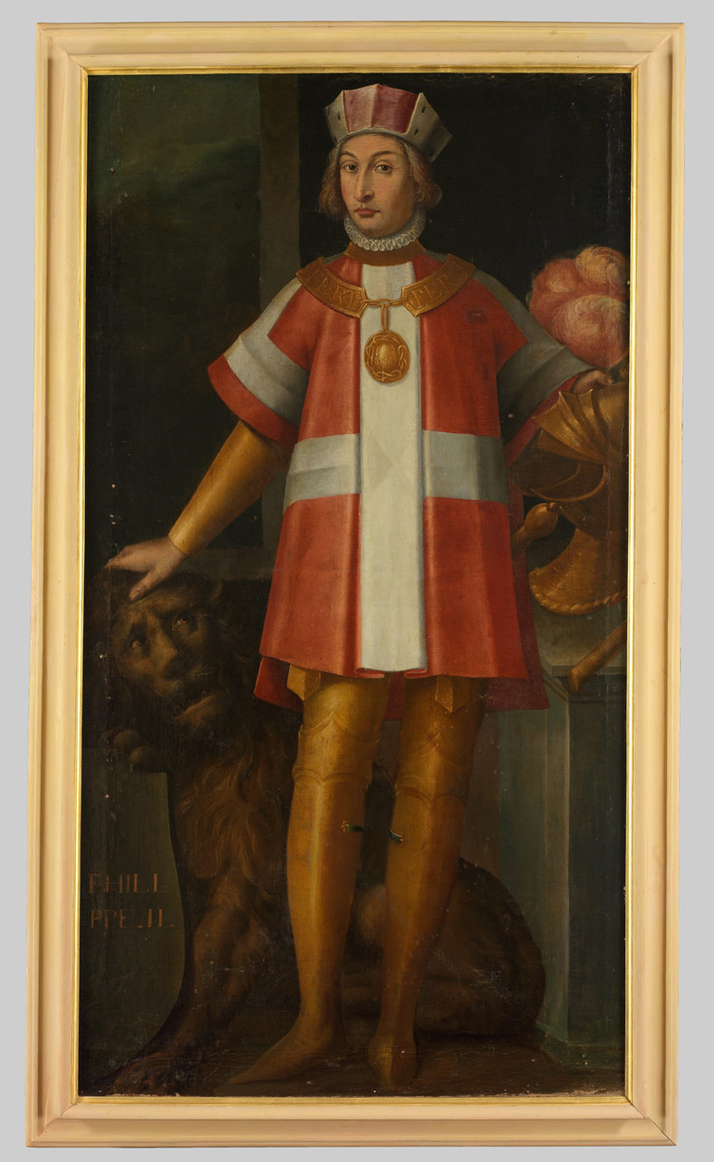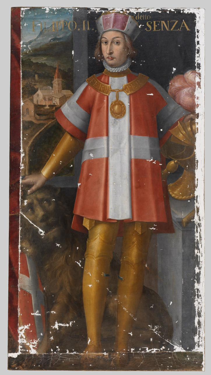 - NOTIZIE STORICO CRITICHE Il dipinto, attualmente conservato presso il castello di Racconigi raffigura Filippo II. Sul retro della tela è presente l'iscrizione S.M. 180 che permette di individuarlo nel castello di Moncalieri nel 1879, come si evince dall'inventario stilato in quell'anno che lo registra tuttavia non nella Galleria n. 70 al primo piano, dove era allestita la quadreria dinastica, ma nel "Magazzino quadri" al secondo piano del castello. A differenza dei quadri che compongono la serie dinastica (da Beroldo, S.M. 28 a Elisabetta Maria di Angelo Capisani, S.M. 116) scaricati, secondo quanto si legge nell'inventario del 1879, nel gennaio del 1920, presso il castello di Racconigi, questo ritratto, così come quelli di Bona di Berry (R 1503), Amedeo VII (R 1504) e di Francesca di Valois (R 6478), viene scaricato a Racconigi il 12 marzo 1890, come documenta il medesimo inventario. E' tuttavia possibile che il ritratto provenga dal medesimo gruppo delle tele con i principi sabaudi più antichi (da Beroldo ad Amedeo II) come sembrano confermare l'iscrizione apposta in alto e lo sfondo paesaggistico emersi durante il recente restauro. Questo dipinto, come la maggior parte della serie dinastica moncalierese, è stato oggetto di ripetuti restauri fino all'inizio del Novecento, subendo sensibili modifiche nel corso del tempo (ampliamenti, inserimento o variazione dell'iscrizione identificativa del personaggio ritratto, uniformizzazione dello sfondo), aspetti confermati dall'attuale campagna di indagini. In questo caso il restauro ha riportato in luce lo sfondo paesaggistico e l'antica iscrizione nella porzione superiore della tela. La fisiognomica di Filippo II, come quella dei principi del più antico gruppo, si presenta analoga a quella raffigurata nel medaglione relativo a questo sovrano inciso nell'"Histoire Généalogique de la Royal Maison De Savoye" di Samuel Guichenon pubblicata a Lione nel 1660 (p. 589). I ritratti dei principi sabaudi presenti in Guichenon sono stati eseguiti utilizzando come modello la serie genealogica della Grande Galleria, fatta appositamente copiare dal pittore Giovanni Domenico Tignola tra il 1658 e il 1659 (G. Spione, 2007, p. 46). Nella serie dinastica allestita a Moncalieri il ritratto di Filippo II era quello attualmente a Racconigi R 1485 come attesta l'iscrizione apposta sul retro della tela, S.M. 80, la cui fisionomia non è però coerente con quella del sovrano sabudo. Del dipinto in esame nel Salone del castello di Moncalieri è conservata una replica settecentesca che tuttavia si differenzia nello sfondo in cui è rappresentato un paesaggio di più ampio orizzonte (cfr. Castello di Moncalieri. Gli appartamenti reali, a cura di F. Pernice, Torino 1997, p. 57)