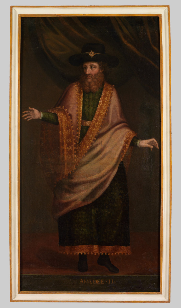 - NOTIZIE STORICO CRITICHE Il dipinto fa parte di un più ampio nucleo attualmente conservato presso il castello di Racconigi. La tela, uniforme per dimensioni alle altre della serie, raffigura Amedeo II. Legata agli altri dipinti dalla catena inventariale S.M., porta il numero S.M. 36, che trova corrispondenza nell 'inventario del 1879, in cui è registrata l'intera serie allora conservata al castello di Moncalieri, al primo piano, nella Galleria n. 70. In questo inventario la serie è composta da 87 quadri, documentati fin dai primi anni Settanta dell'Ottocento, da un altro inventario non datato, ma precedente al 1872, che li registra nella Galleria a ponente, dal numero 209 al 296: "Ottantasette quadri dipinti ad olio su tela rappresentante la Colezione (sic) dei R.li di Casa Savoja cioè da Beroldo a Maria Adelaide tutti con cornici colorite giallo Lunghezza 2,20 larghezza 1,18". Già nella prima metà dell'Ottocento Goffredo Casalis aveva avuto modo di visitare la "stupenda galleria, della lunghezza di centocinquanta passi; ai due lati della quale sono appesi i ritratti, in grandezza naturale, di tutti i Sovrani Sabaudi, ed accanto ad essi veggonsi pure le immagini delle loro Auguste Consorti". Tutti i quadri della serie, risultano, nell'inventario del 1879, scaricati nel gennaio del 1920, presso il castello di Racconigi, dove si trovano tuttora, ad eccezione di alcuni, non più presenti fin dagli anni Cinquanta del Novecento (non compaiono infatti nell'inventario del 1951). Il dipinto giunse dunque a Racconigi negli anni di Vittorio Emanuele III e della regina Elena: fin dall'inizio del secolo infatti i sovrani avevano intrapreso il "riordinamento del Reale Castello di Racconigi", (1902). Per quanto riguarda l'intera serie appare evidente che sia stata via via accresciuta con il trascorrere dei secoli, fino all'Ottocento. Alcuni ritratti seicenteschi sono copie di altre tele, come evidenzia l'esistenza di più versioni dei medesimi. I ritratti, nella maggior parte dei casi, sono stati oggetto non solo di ripetuti restauri che li hanno interessati fino all'inizio del Novecento, ma hanno anche subito sensibili modifiche nel corso del tempo (ampliamenti, inserimento o variazione dell'iscrizione identificativa del personaggio ritratto, uniformizzazione dello sfondo), aspetti confermati dall'attuale campagna di indagini. In questo caso il restauro ha riportato in luce l'antica iscrizione nella porzione inferiore a fianco del personaggio. Già C. E. Bertana, aveva individuato la presenza di una galleria di ritratti un tempo a Moncalieri, poi trasferita a Racconigi, non collegandola tuttavia a questa serie. Nuove ricerche hanno interessato una parte delle tele in questione in occasione della mostra tenutasi a Venaria (2007-2008), evidenziandone l'appartenenza alla galleria moncalierese sulla base di un elenco conservato presso la Biblioteca Reale, datato al 1780 (Misc. Patria, 46,24). Il documento riporta tuttavia solo i ritratti dei principi, da Beroldo a Carlo Emanuele III. Non vi compaiono invece le principesse, dato che induce a pensare per queste ultime a una provenienza da altre residenze. Il documento si riferisce probabilmente ai lavori necessari alla costituzione della galleria di ritratti voluta nell'ambito del generale rilancio del castello di Moncalieri, intrapreso da Vittorio Amedeo III, appena salito al trono (P. Astrua, 1987, p.88). All'interno della serie presa in esame è pertanto possibile distinguere alcuni diversi gruppi: al primo appartengono i dipinti risalenti al XVII secolo. Il ritratto in esame sembra essere uno dei più antichi del gruppo, come è stato confermato dalle indagini condotte nel recente restauro, che ha riportato in luce i raffinatissimi accordi cromatici al limite del cangiantismo ancora di sapore manierista, riscontrabili anche in altre tele della serie come i ritratti di Filiberto I (R 1513), Umberto III (R 1519), Filippo I (1515), Filippo II (R 1501). In questi dipinti è utile rilevare la presenza di una più antica iscrizione identificativa del personaggio inserita sullo sfondo, che appare oggi non centrata, e pertanto spesso mutila, dato che induce a ritenere che le tele un tempo fossero unite. I ritratti dei principi del più antico gruppo (da Beroldo fino a Carlo Emanuele I), e dunque anche quello in esame, si presentano identici nella fisiognomica ai volti dei sovrani incisi nei medaglioni dell'"Histoire Généalogique de la Royal Maison De Savoye" di Samuel Guichenon pubblicata a Lione nel 1660 (p. 208), eseguiti utilizzando come modello la serie genealogica della Grande Galleria, fatta appositamente copiare dal pittore Giovanni Domenico Tignola tra il 1658 e il 1659 (G. Spione, 2007, p. 46). Il personaggio è inserito fra due pilastri che ne costituiscono lo sfondo insieme ad un drappo: la presenza dei pilastri sullo sfondo si ritrova anche nei dipinti R 1524, R 11506, R 1510, R 1481, R 1489, R 1487, R 1519, R 1517. Nel castello di Racconigi esiste una replica a mezzo busto di questo ritratto (R 5604)