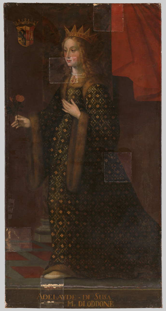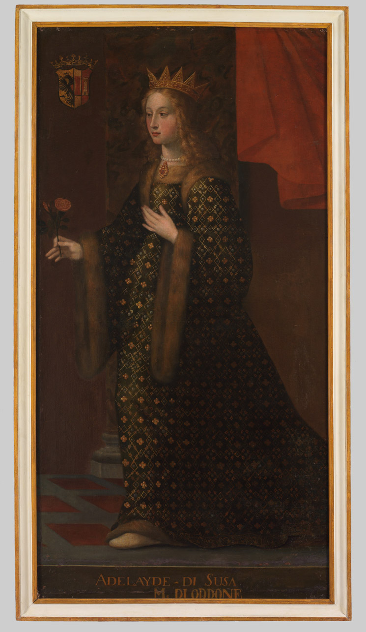 - NOTIZIE STORICO CRITICHE Il dipinto fa parte di un più ampio nucleo oggi conservato presso il castello di Racconigi. La tela, uniforme alle altre della serie per dimensioni, raffigura Adelaide di Susa moglie di Oddone I. E' legata alle altre dalla catena inventariale S.M., di cui porta il numero S.M. 35, da riferirsi all'inventario del castello di Moncalieri del 1879. In quell'anno i quadri erano conservati al primo piano, nella Galleria n. 70. Nell'inventario la serie è composta da 87 dipinti, documentati anche da un altro inventario non datato, ma precedente al 1872. Questi quadri risultano, nell'inventario del 1879, scaricati nel gennaio del 1920, presso il castello di Racconigi, dove si trovano tuttora, ad eccezione di alcuni non più presenti fin dagli anni Cinquanta del Novecento. Le opere, fra cui il ritratto in questione giunsero a Racconigi negli anni di Vittorio Emanuele III e della regina Elena. Per quanto riguarda l'intera serie appare evidente che sia stata via via accresciuta con il trascorrere dei secoli, fino all'Ottocento. I ritratti sono stati oggetto non solo di ripetuti restauri, ma hanno anche subito sensibili modifiche nel corso del tempo (ampliamenti, inserimento o variazione dell'iscrizione identificativa del personaggio ritratto, uniformizzazione dello sfondo), aspetti confermati dall'attuale campagna di indagini. Già C. E. Bertana, aveva individuato la presenza di una galleria di ritratti un tempo a Moncalieri, poi trasferita a Racconigi, non collegandola tuttavia a questa serie. Nuove ricerche hanno interessato una parte delle tele in occasione della mostra di Venaria (2007-2008), evidenziandone l'appartenenza alla galleria moncalierese sulla base di un elenco conservato presso la Biblioteca Reale, datato al 1780 (Misc. Patria 46,24). Il documento del 1780, che si riferisce probabilmente ai lavori necessari alla costituzione della galleria di ritratti voluta nell'ambito del generale rilancio del castello di Moncalieri, intrapreso da Vittorio Amedeo III, appena salito al trono (P. Astrua, 1987 p. 88), riporta tuttavia solo i ritratti dei principi, da Beroldo a Carlo Emanuele III. Non vi compaiono invece le principesse, dato che induce a pensare per queste ultime a una provenienza da altre residenze. Altri documenti relativi a un intervento di restauro avvenuto all'inizio degli anni Settanta del Settecento per opera di Pietro Paolo Wehrlin elencano poi 36 ritratti di principesse sabaude su cui il pittore sarebbe dovuto intervenire, prima di inviarle a Moncalieri fra cui "n° 8 Adelaida Magnifredi Marchionis Segisini Filia" (Bib. Reale, TO, Registri Recapiti, 1773, II, f. 541). Wehrlin afferma di aver compiuto ampliamenti delle tele, o di avervi aggiunto l'iscrizione con il nome dell'effigiata. Mentre i ritratti dei principi del più antico gruppo (da Beroldo fino a Carlo Emanuele I), si presentano identici nella fisiognomica ai volti dei sovrani incisi nei medaglioni dell'"Histoire Généalogique de la Royal Maison De Savoye" di Samuel Guichenon pubblicata a Lione nel 1660 e mostrano un'iconografia codificata, questo non accade per le principesse. Per quanto concerne gli atteggiamenti e l'abbigliamento, un sicuro modello è invece fornito dalle bellissime tavole delle "Austriache Gentis Imagines" (già riferimento per Pingone), realizzate da Francesco Terzio e tradotte a stampa tra il 1558 e il 1573. Nel caso di Adelaide di Susa si veda la tavola "Leonora Federici IIII Ux" al f. 46 dell'esemplare conservato presso la Biblioteca Reale di Torino (T 52, 9), da cui il pittore sabaudo riprende sia l'impostazione generale della figura sia l'abito dalle ampie maniche bordate di pelliccia