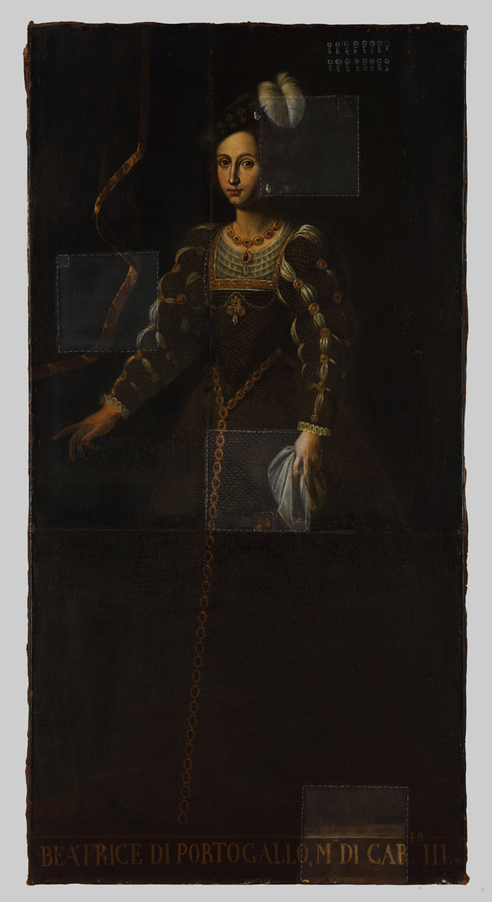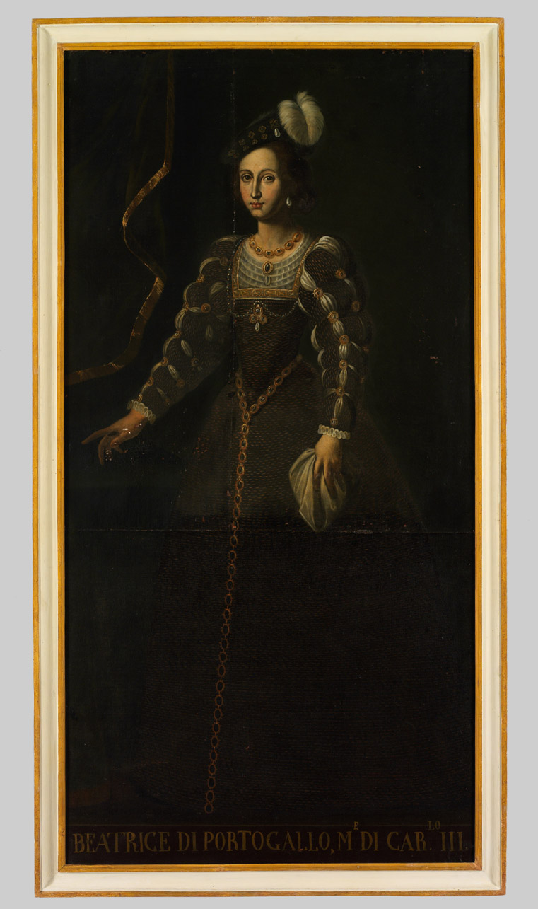- NOTIZIE STORICO CRITICHE Il dipinto fa parte di un più ampio nucleo oggi conservato presso il castello di Racconigi. La tela, uniforme alle altre della serie per dimensioni, raffigura Beatrice di Portogallo moglie di Carlo III. E' legata alle altre dalla catena inventariale S.M., di cui porta il numero S.M. 87, da riferirsi all'inventario del castello di Moncalieri del 1879. In quell'anno i quadri erano conservati al primo piano, nella Galleria n. 70. Nell'inventario la serie è composta da 87 dipinti, documentati anche da un altro inventario non datato, ma precedente al 1872. Questi quadri risultano, nell'inventario del 1879, scaricati nel gennaio del 1920, presso il castello di Racconigi, dove si trovano tuttora, ad eccezione di alcuni non più presenti fin dagli anni Cinquanta del Novecento. Le opere, fra cui il ritratto in questione giunsero a Racconigi negli anni di Vittorio Emanuele III e della regina Elena. Per quanto riguarda l'intera serie appare evidente che sia stata via via accresciuta con il trascorrere dei secoli, fino all'Ottocento. I ritratti sono stati oggetto non solo di ripetuti restauri, ma hanno anche subito sensibili modifiche nel corso del tempo (ampliamenti, inserimento o variazione dell'iscrizione identificativa del personaggio ritratto, uniformizzazione dello sfondo), aspetti confermati dall'attuale campagna di indagini. In questo caso il restauro ha riportato in luce lo stemma nella porzione superiore sinistra della tela. Già C. E. Bertana, aveva individuato la presenza di una galleria di ritratti un tempo a Moncalieri, poi trasferita a Racconigi, non collegandola tuttavia a questa serie. Nuove ricerche hanno interessato una parte delle tele in occasione della mostra di Venaria (2007-2008), evidenziandone l'appartenenza alla galleria moncalierese sulla base di un elenco conservato presso la Biblioteca Reale, datato al 1780 (Misc. Patria 46,24). Il documento del 1780, che si riferisce probabilmente ai lavori necessari alla costituzione della galleria di ritratti voluta nell'ambito del generale rilancio del castello di Moncalieri, intrapreso da Vittorio Amedeo III, appena salito al trono (P. Astrua, 1987 p. 88), riporta tuttavia solo i ritratti dei principi, da Beroldo a Carlo Emanuele III. Non vi compaiono invece le principesse, dato che induce a pensare per queste ultime a una provenienza da altre residenze. Altri documenti relativi a un intervento di restauro avvenuto all'inizio degli anni Settanta del Settecento per opera di Pietro Paolo Wehrlin elencano poi 36 ritratti di principesse sabaude su cui il pittore sarebbe dovuto intervenire, prima di inviarle a Moncalieri fra cui "n. 11Beatrix Emanuelis Lisitaneae Regis filia. Caroli III Sab. Ducis uxor" (Bib. Reale, TO, Registri Recapiti, 1772, II, f. 996). Wehrlin afferma di aver compiuto ampliamenti delle tele, o di avervi aggiunto l'iscrizione con il nome dell'effigiata. Per quanto concerne gli atteggiamenti e l'abbigliamento, mentre per le principesse vissute entro il Quattrocento un sicuro modello è fornito dalle bellissime tavole delle "Austriache Gentis Imagines" (già riferimento per Pingone), realizzate da Francesco Terzio e tradotte a stampa tra il 1558 e il 1573, in quelle del XVI e XVII secolo i pittori sembrano orientarsi ai coevi modelli della ritrattistica europea di corte
