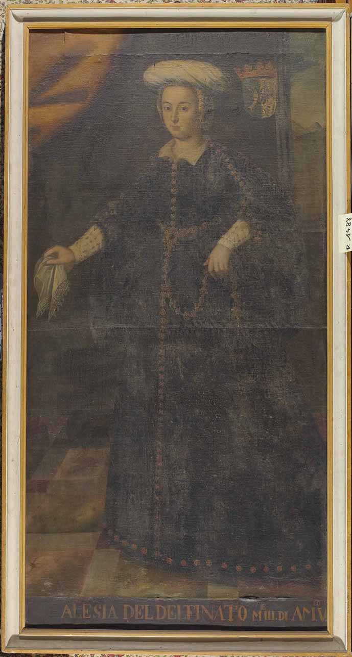 - NOTIZIE STORICO CRITICHE Il dipinto fa parte di un più ampio nucleo oggi conservato presso il castello di Racconigi. La tela, uniforme alle altre della serie per dimensioni, raffigura Alessia del Delfinato terza moglie di Amedeo V. E' legata alle altre dalla catena inventariale S.M., di cui porta il numero S.M. 60, da riferirsi all'inventario del castello di Moncalieri del 1879. In quell'anno i quadri erano conservati al primo piano, nella Galleria n.70. Nell'inventario la serie è composta da 87 dipinti, documentati anche da un altro inventario non datato, ma precedente al 1872. Questi quadri risultano, nell'inventario del 1879, scaricati nel gennaio del 1920, presso il castello di Racconigi, dove si trovano tuttora, ad eccezione di alcuni non più presenti fin dagli anni Cinquanta del Novecento. Le opere, fra cui il ritratto in questione giunsero a Racconigi negli anni di Vittorio Emanuele III e della regina Elena. Per quanto riguarda l'intera serie appare evidente che sia stata via via accresciuta con il trascorrere dei secoli, fino all'Ottocento. I ritratti sono stati oggetto non solo di ripetuti restauri, ma hanno anche subito sensibili modifiche nel corso del tempo (ampliamenti, inserimento o variazione dell'iscrizione identificativa del personaggio ritratto, uniformizzazione dello sfondo), aspetti confermati dall'attuale campagna di indagini che non ha tuttavia interessato questo dipinto. Già C. E. Bertana, aveva individuato la presenza di una galleria di ritratti un tempo a Moncalieri, poi trasferita a Racconigi, non collegandola tuttavia a questa serie. Nuove ricerche hanno interessato una parte delle tele in occasione della mostra di Venaria (2007-2008), evidenziandone l'appartenenza alla galleria moncalierese sulla base di un elenco conservato presso la Biblioteca Reale, datato al 1780 (Misc. Patria 46,24). Il documento del 1780, che si riferisce probabilmente ai lavori necessari alla costituzione della galleria di ritratti voluta nell'ambito del generale rilancio del castello di Moncalieri, intrapreso da Vittorio Amedeo III, appena salito al trono (P. Astrua, 1987 p. 88), riporta tuttavia solo i ritratti dei principi, da Beroldo a Carlo Emanuele III. Non vi compaiono invece le principesse, dato che induce a pensare per queste ultime a una provenienza da altre residenze. Altri documenti relativi a un intervento di restauro avvenuto all'inizio degli anni Settanta del Settecento per opera di Pietro Paolo Wehrlin elencano poi 36 ritratti di principesse sabaude su cui il pittore sarebbe dovuto intervenire, prima di inviarle a Moncalieri fra cui "n° 29 Alexia Humbertis Viennentis Delphini filia Amedei V Sab. Comitis Uxor tertia" (Bib. Reale, TO, Registri Recapiti, 1772, II, f. 996). Wehrlin afferma di aver compiuto ampliamenti delle tele, o di avervi aggiunto l'iscrizione con il nome dell'effigiata. Mentre i ritratti dei principi del più antico gruppo (da Beroldo fino a Carlo Emanuele I), si presentano identici nella fisiognomica ai volti dei sovrani incisi nei medaglioni dell'"Histoire Généalogique de la Royal Maison De Savoye" di Samuel Guichenon pubblicata a Lione nel 1660 e mostrano un'iconografia codificata, questo non accade per le principesse. Per quanto concerne gli atteggiamenti e l'abbigliamento, un sicuro modello è invece fornito dalle bellissime tavole delle "Austriache Gentis Imagines" (già riferimento per Pingone), realizzate da Francesco Terzio e tradotte a stampa tra il 1558 e il 1573. Nel caso di Alessia del Delfinato si veda la tavola "Virida Leopoldi Ux" al f. 49 dell'esemplare conservato presso la Biblioteca Reale di Torino (T 52, 9), da cui il pittore sabaudo riprende l'atteggiamento della figura che trattiene con la mano sinistra la catenella le cinge la vita. Alle spalle della principessa si apre una finestra in cui è inserito un paesaggio montano analogamente alla figura di Foetide di Tolosa moglie di Umberto III (R 1520). Il dipinto è impostato secondo i modelli della ritrattistica di corte diffusosi a partire dalla seconda metà del XVI secolo in ambito lombardo e veneto di cui anche Francesco Terzi è un significativo interprete