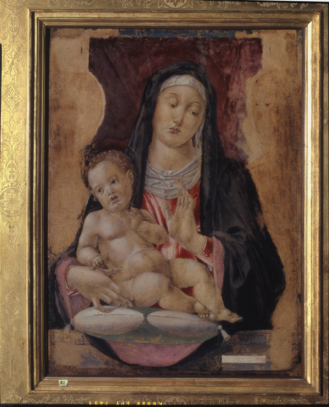 - NOTIZIE STORICO CRITICHE Il dipinto fu acquistato dalla Regia Pinacoteca Nazionale nel 1875 dall’antiquario Gherardi. Dapprima inventariato con l’attribuzione a Gerolamo Vivarini (Gamba 1871), venne restituito al catalogo di Bartolomeo (Gamba, 1884) sulla base di una firma apocrifa e della data “1481”, in seguito parzialmente rimosse da un restauro del 1939. Ciononostante, la paternità dell’opera non fu più messa in discussione dalla critica sino all’ipotesi avanzata da Noemi Gabrielli, che spostava dapprima il dipinto all’ambito generico della bottega vivariniana (1959; 1965) e poi a Jacopo da Valenza (1971). Qualche anno dopo Zeri (1973) riproponeva il nome di Bartolomeo, non escludendo la possibilità che la firma potesse essere autentica. Certamente il pessimo stato conservativo e i rifacimenti subiti dalla tavola, che un tempo presentava ai lati della Madonna con il Bambino due Santi, oggi solo parzialmente intuibili dai contorni sopravvissuti, non ammette un giudizio inderogabile in merito all’autografia. Acuisce semmai l’andamento formale robusto e ieratico delle figure superstiti, che si direbbero tutto sommato tipiche della “rustica freschezza” di Bartolomeo (Pallucchini, 1961), mostrando però timidi legami con le coeve sperimentazioni belliniane sul tema della Madonna con il Bambino, metabolizzate anche attraverso la pittura più aggiornata del fratello Alvise Vivarini. Proviene probabilmente da quest’ultimo lo spunto iconografico del Bambino seduto sul cuscino (cfr. Venturi, 1914) che, insieme alla veste della Vergine con la manica stretta poco sopra il polso da una coppia di bottoncini sferici, si ritrova molto simile su una tavola di soggetto analogo con sfondo dorato di collezione privata inglese, attribuita con fermezza da Rodolfo Pallucchini a Bartolomeo alla metà degli anni settanta del Quattrocento (Pallucchini, 1988, pp. 134-136). In ogni caso l’atteggiamento e la resa grafica delle mani, non prive di forzature anatomiche e proprio per questo raffinatissime, oltre a ricordare la solennità gestuale dalla contemporanea pittura di Antonello da Messina sono tra gli elementi che sembrano discostare di più la tavola di Torino dalle propaggini bellunesi della bottega vivariniana come Jacopo da Valenza, Antonio Cesa o Antonio da Tisoi
