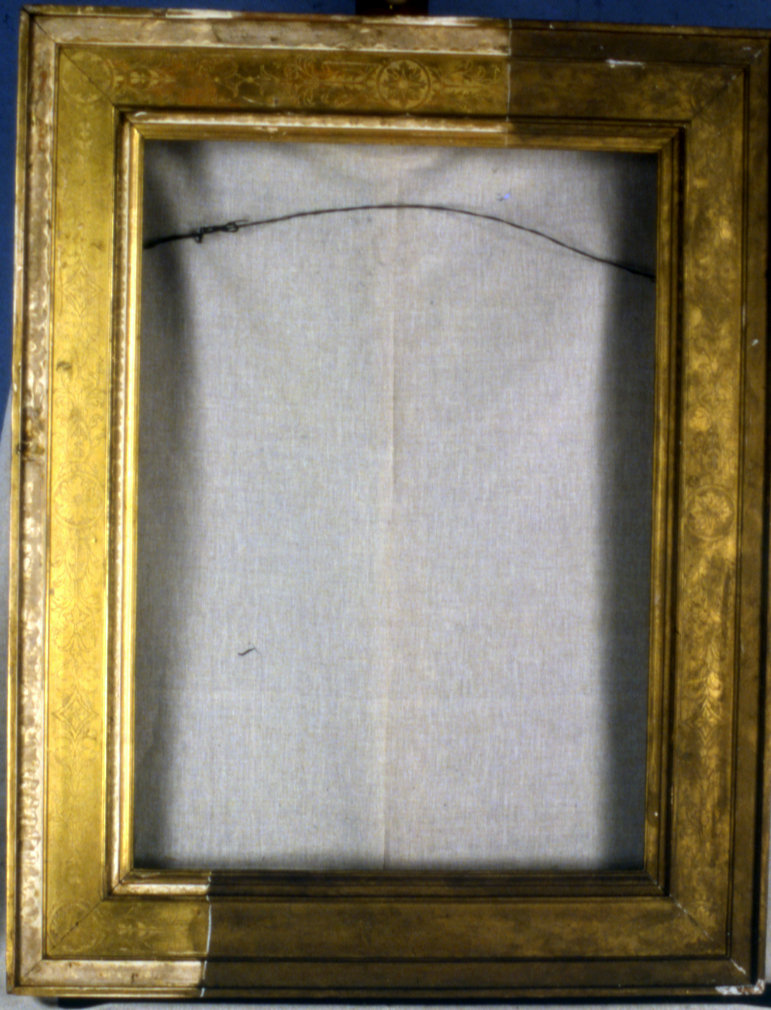 DIPINTO: parchettatura rigida con 13 traverse verticali e 17 orizzontali. Colorazione protettiva blu sul retro della tavola. CORNICE: del XIX secolo, dorata a cassetta con decorazioni a bulino. Telaio con incastro angolare a 45° e inserti ortogonali di rinforzo; inserimento del dipinto con listello di raccordo e sbarrette metalliche. Gancio ad 'e' in ferro