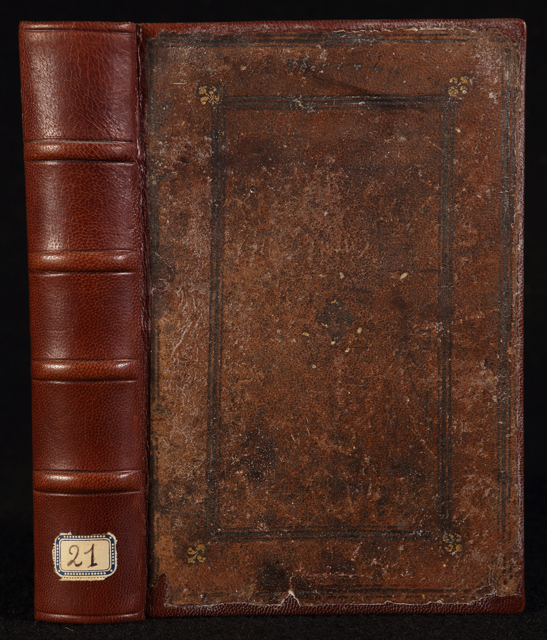 legatura rigida in pelle su supporto in cartone; la legatura è di restauro con riapplicazione dei piatti originali. Decorazione a secco con cornice esterna di filetto multiplo; cornice dello specchio di triplo filetto accantonata esterna con ferro dorato a giglio, ripetuto in composizione al centro dello specchio, a secco. Dorso di restauro. Tagli rossi. Fogli di guardia anteriori con iscrizioni e note di possesso manoscritte; tracce di nota manoscritta sul foglio di guardia posteriore
