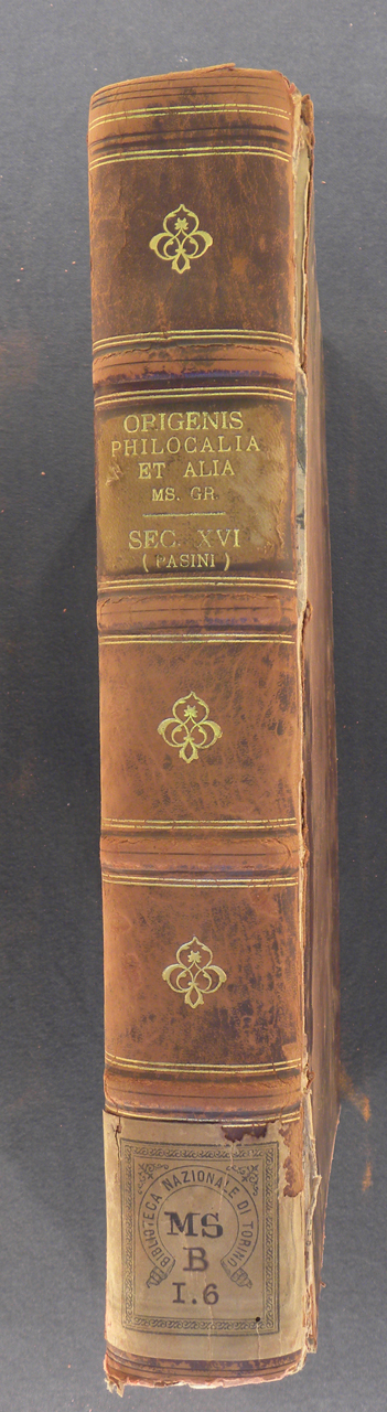 legatura rigida in pelle su supporto in cartone; la legatura è di restauro con riapplicazione dei piatti originali. Decorazione ai piatti con cornice esterna di fasci di filetti a secco e filetto dorato, incurvato internamente agli angoli; stella a sei punte agli angoli; seconda cornice di doppio filetto dorato, accantonato esterno con ferro a foglia; motivo vegetale al centro dei lati, entro fasci di filetti a secco; cornice dello specchio romboidale in doppio filetto dorato entro fasci di filetti a secco; ferro dorato a foglia nella parte superiore e inferiore dello specchio; al centro dello specchio del piatto superiore super libros entro cornice tonda di doppio filetto dorato, seguìto da super libros senza cornice. Al centro dello specchio del piatto inferiore cartiglio vuoto entro cornice tonda di doppio filetto dorato. Dorso di restauro. Tagli dorati e decorati a impressione; autore e titolo sul taglio anteriore. Etichetta della legatoria applicata al contropiatto inferiore. Tracce di graffe e contrograffe
