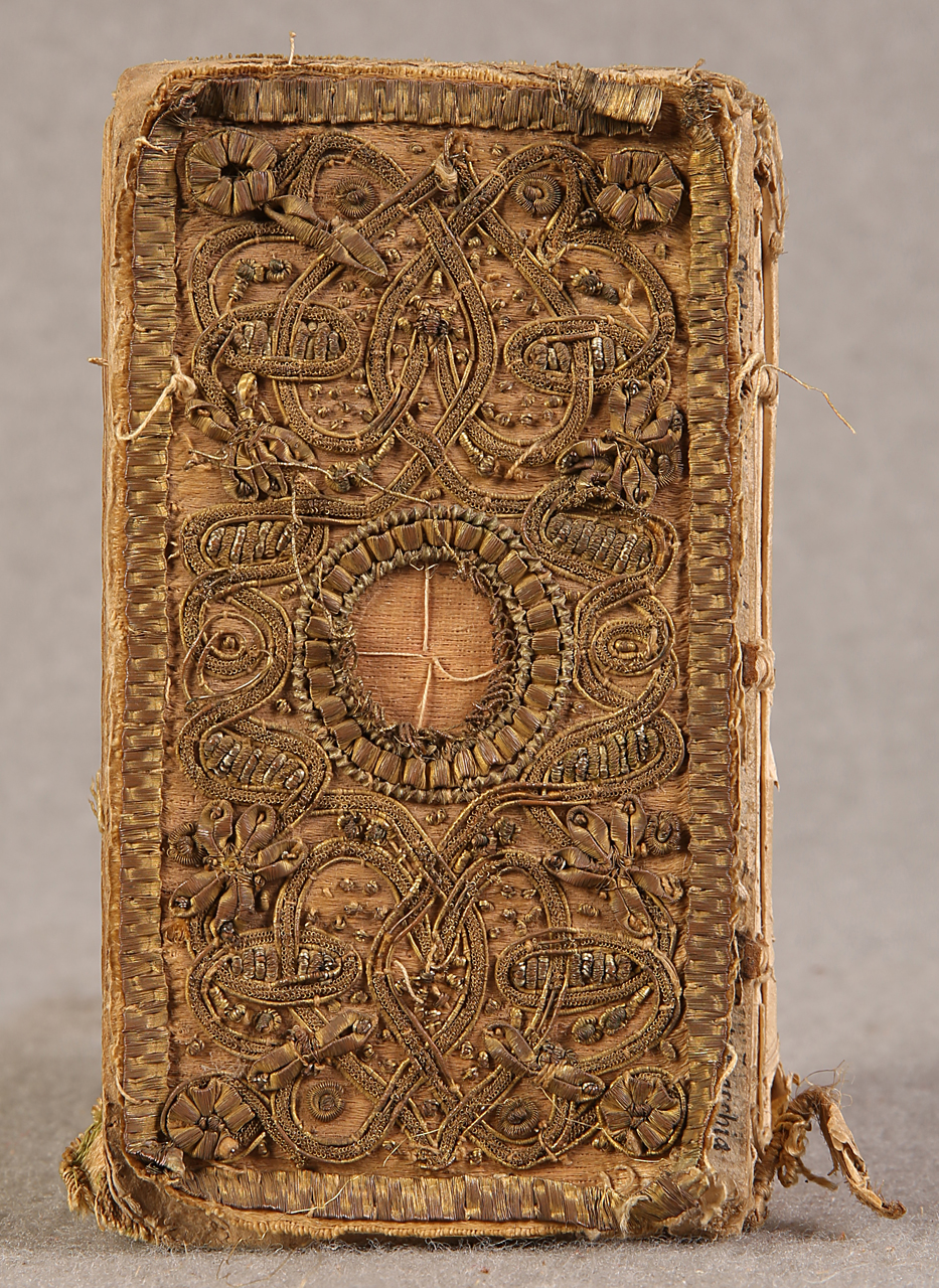 legatura rigida in tessuto su supporto in cartone, decorata al piatto inferiore con cornice dello specchio di passamaneria in filo metallico; specchio con volute, corolle e punti; al centro cartella tonda vuota. Dorso mancante. Tagli dorati e goffrati