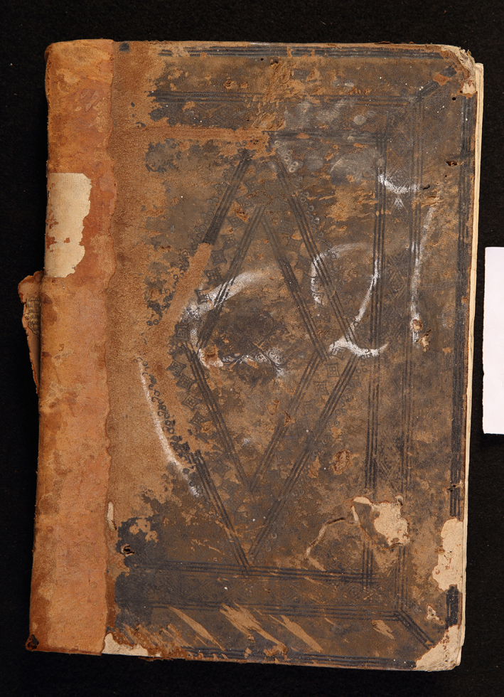 legatura rigida in pelle su supporto in cartone, decorata a secco ai piatti con cornice esterna di fasci di filetto, raccordata alla seconda cornice; seconda cornice con graticcio seminato di corolle, entro fasci di filetto; cornice dello specchio a losanga con motivo a tre punti ripetuto e losanga a lati concavi, entro fasci di filetto; al centro dello specchio motivo romboidale con volute vegetali; super libros impresso in oro sul piatto inferiore. Dorso rivestito con pelle di rinforzo; etichetta con autore e titolo. Tagli grezzi. Nota manoscritta sul foglio di guardia superiore. Tracce di lacci di chiusura sui piatti