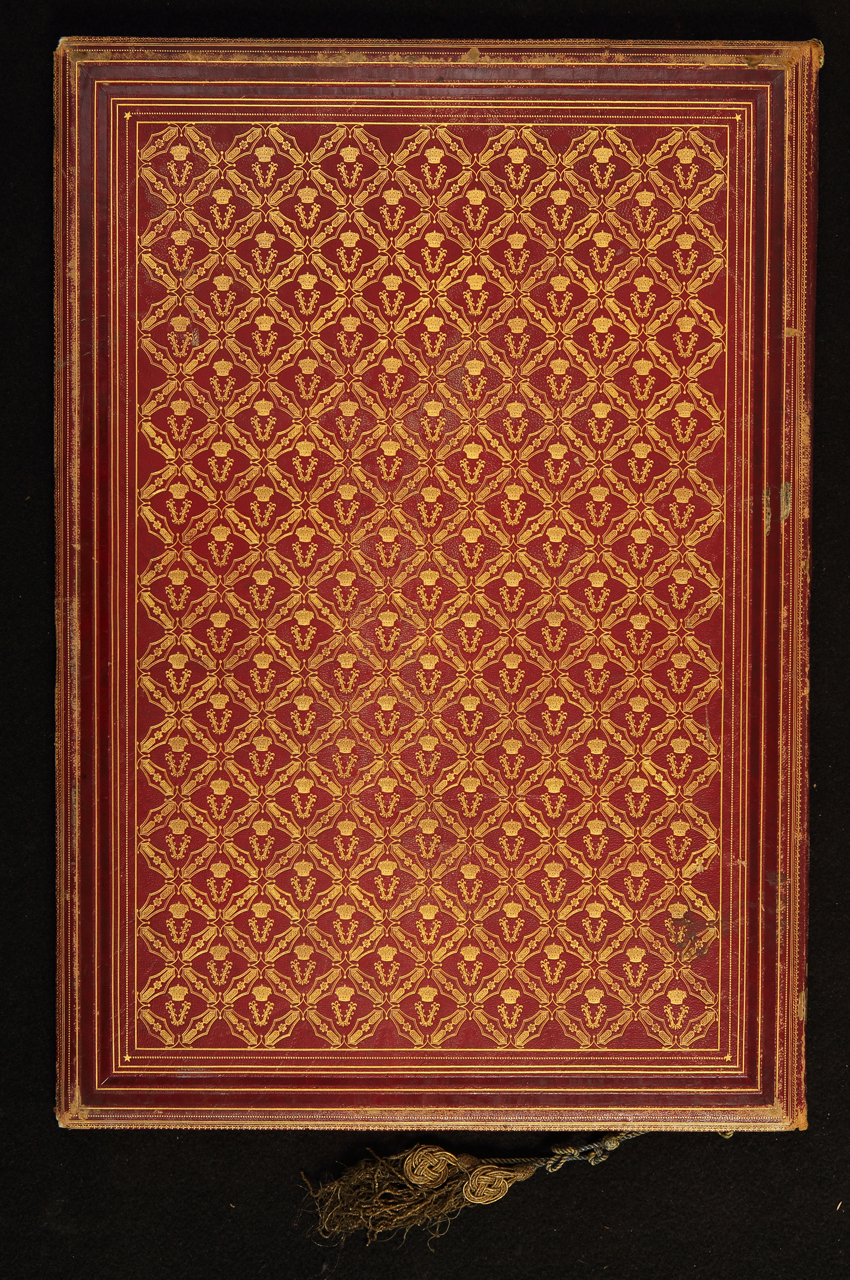 legatura rigida in pelle zigrinata su supporto in cartone, decorata al piatto superiore con cornice esterna impressa in oro con trifoglio, archetti, doppio filetto, linea di punti accantonata agli angoli con punto più grosso, filetto; seconda cornice impressa a secco; terza cornice di filetto dorato; quarta cornice impressa a secco; cornice dello specchio impressa in oro con doppio filetto, catenella accantonata agli angoli con stella a sei punte, filetto; specchio con seminato di ricco decoro a losanga impresso in oro; la cornice della losanga è composta da fiore, lace d'amour e motto "FERT"; al centro della losanga lettera "V" coronata; al centro dello specchio arma impressa in oro entro cornice romboidale dorata di doppio filetto, linea di punti accantonata agli angoli con stella, filetto; al piatto inferiore, stessa cornice esterna e seminato di ricco decoro a losanga con stesso motivo. Dorso liscio. Tagli grezzi. Labbri dorati. Unghiature dorate. Guardie e controguardie in seta moirée. Nome del legatore impresso in oro sul contropiatto inferiore "M. Vezzosi e C.". Segnalibro in corda dorata con fiocchi