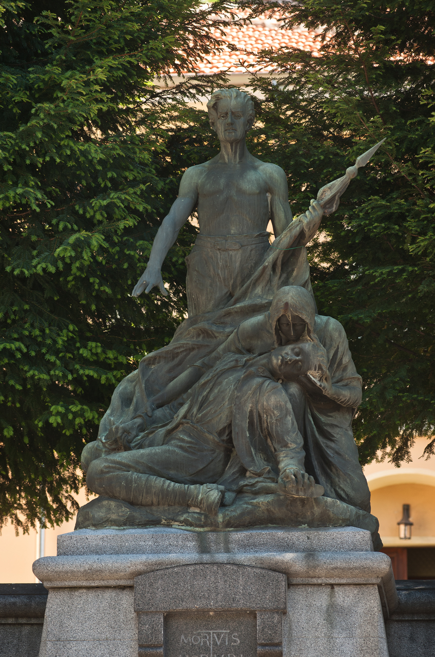 Monumento commemorativo ad emiciclo. Al centro, gruppo scultoreo bronzeo su piedistallo, raffigurante una figura femminile che veglia su un soldato accasciato e morente, con alle spalle un altro soldato, a petto nudo, che porta una bandiera. Sul bronzo vi è la firma dell’artefice. Sul piedistallo è presente una targa in granito a stendardo riportante incisa un’iscrizione latina e la data di posa. Ai lati del gruppo scultoreo, sul muro dell’emiciclo, due aquile con ghirlande e incise le date rispettivamente di inizio e fine del primo conflitto mondiale. Alle estremità sono state collocate successivamente due lapidi commemorative della guerra d’Africa (a sinistra) e la seconda guerra mondiale (a destra). Sul muro dell’emiciclo infine sono incisi i nomi dei soldati caduti, senza ulteriori indicazioni di appartenenza