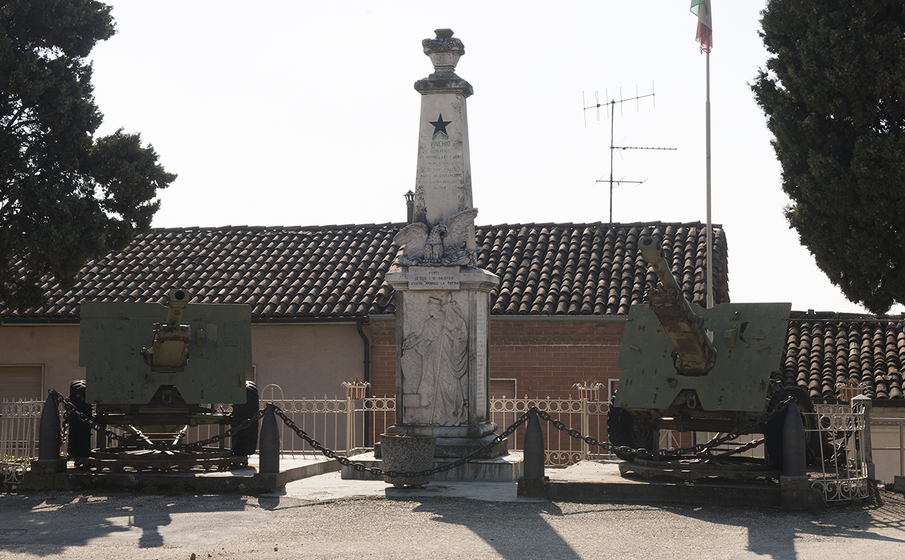 Monumento a obelisco in marmo affiancato da due cannoni della Grande Guerra e circondato da una catena in ferro sorretta da proietti d’artiglieria. Il tronco dell’obelisco, sormontato da un vaso decorativo, presenta l’iscrizione dedicatoria del Comune. Più in basso un’aquila, allegoria della Vittoria, regge tra gli artigli la bandiera e sovrasta una piccola targa con un'ulteriore epigrafe. Il basamento dell’obelisco presenta, sul lato frontale, un rilievo ritraente la Patria, raffigurata come una figura femminile con una corona turrita, la bandiera e uno scudo. Gli altri tre lati del basamento riportano l’elenco dei caduti nella prima guerra mondiale con caratteri incisi e ripassati di colore nero. Il lato posteriore presenta, nella parte inferiore, l'elenco dei caduti della seconda guerra mondiale