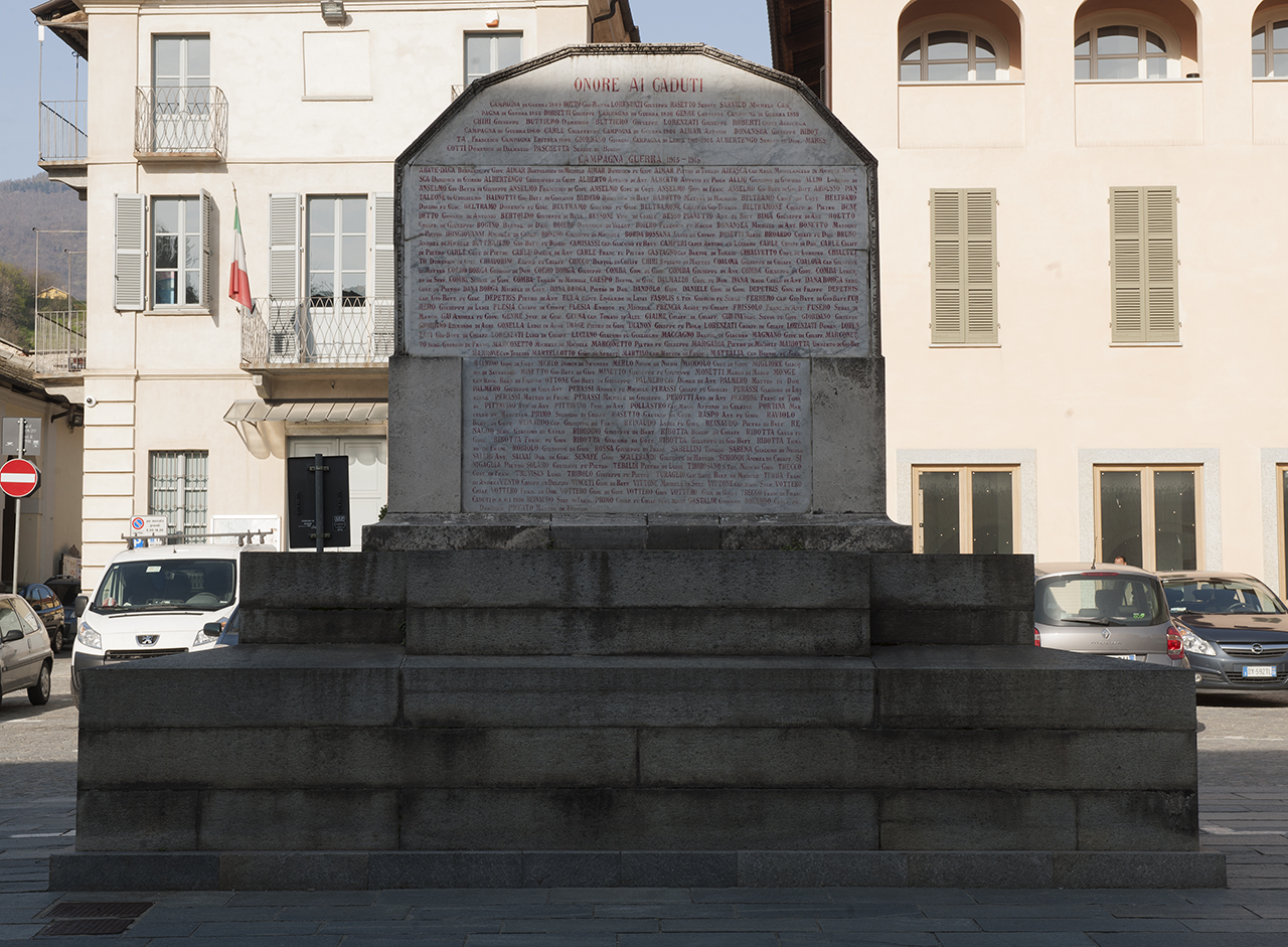 Monumento a stele su basamento a gradoni in pietra. La superficie della stele è per la maggior parte occupata da un altorilievo bronzeo raffigurante al centro due uomini nudi (allegoria di soldati come eroi antichi, ritratti uno davanti all'altro). Quello anteriore, morente, è rappresentato con le ginocchia piegate e la testa riversa all'indietro; quello posteriore regge un pugnale con la mano destra. Di fianco a loro, a destra, compare l'allegoria della Vittoria alata. Lateralmente due targhe in pietra recano iscrizioni incise e ripassate di colore rosso. Sul basamento è riportata la data d'escecuizione 1921. Sul retro della stele è inciso l'elenco dei caduti della prima guerra mondiale. Il monumento è firmato da Romolo Bernardi, 1921