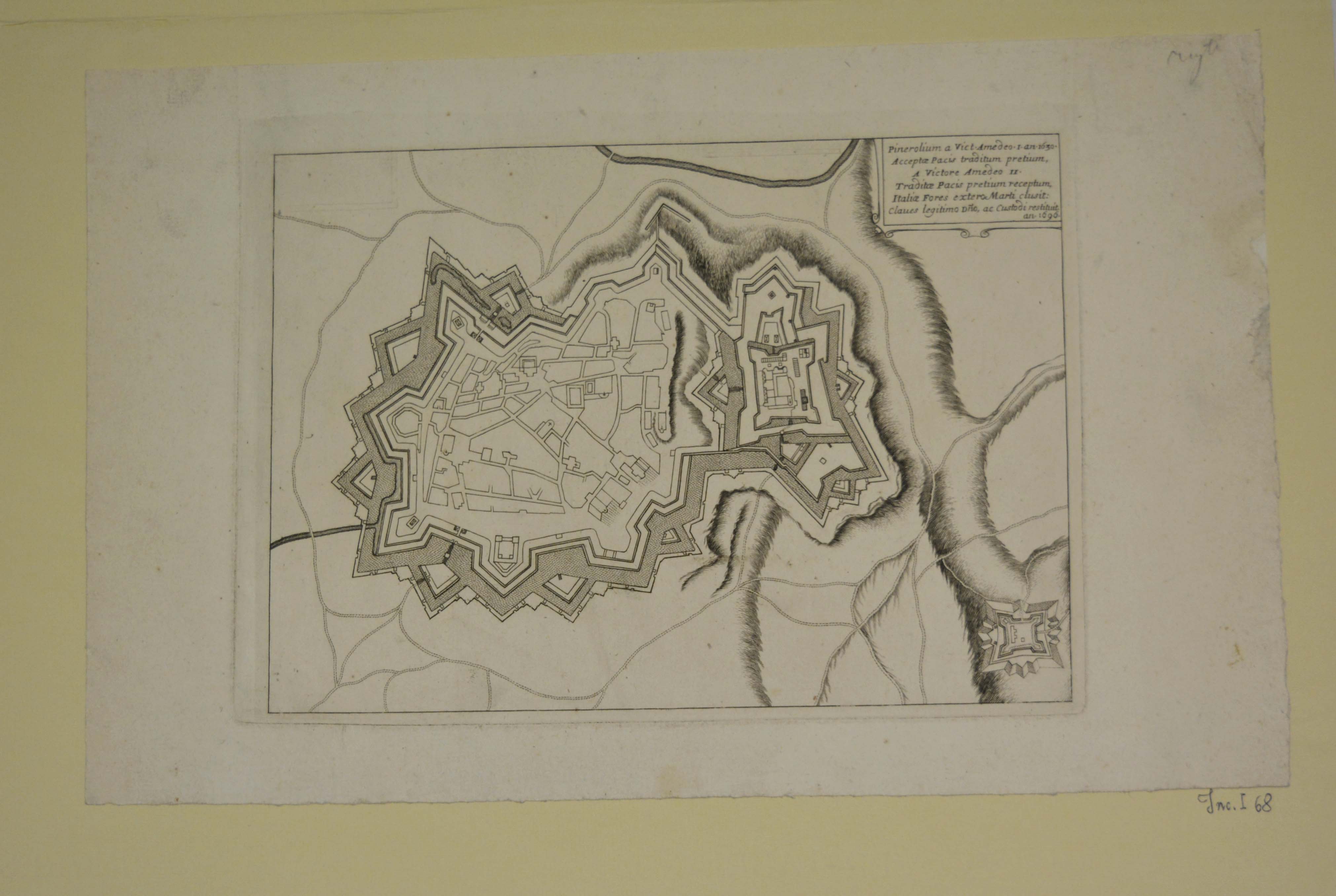 Pinerolium a Vict. Amedeo I an. 1630 Acceptae Pacis traditum pretium, a Victore Amedeo II Traditae Pacis pretium receptum, Italiae Fores extero Marti clusit: Claves legitimo Domino, ac Custodi restituit an. 1696. pianta topografica della città di Pinerolo