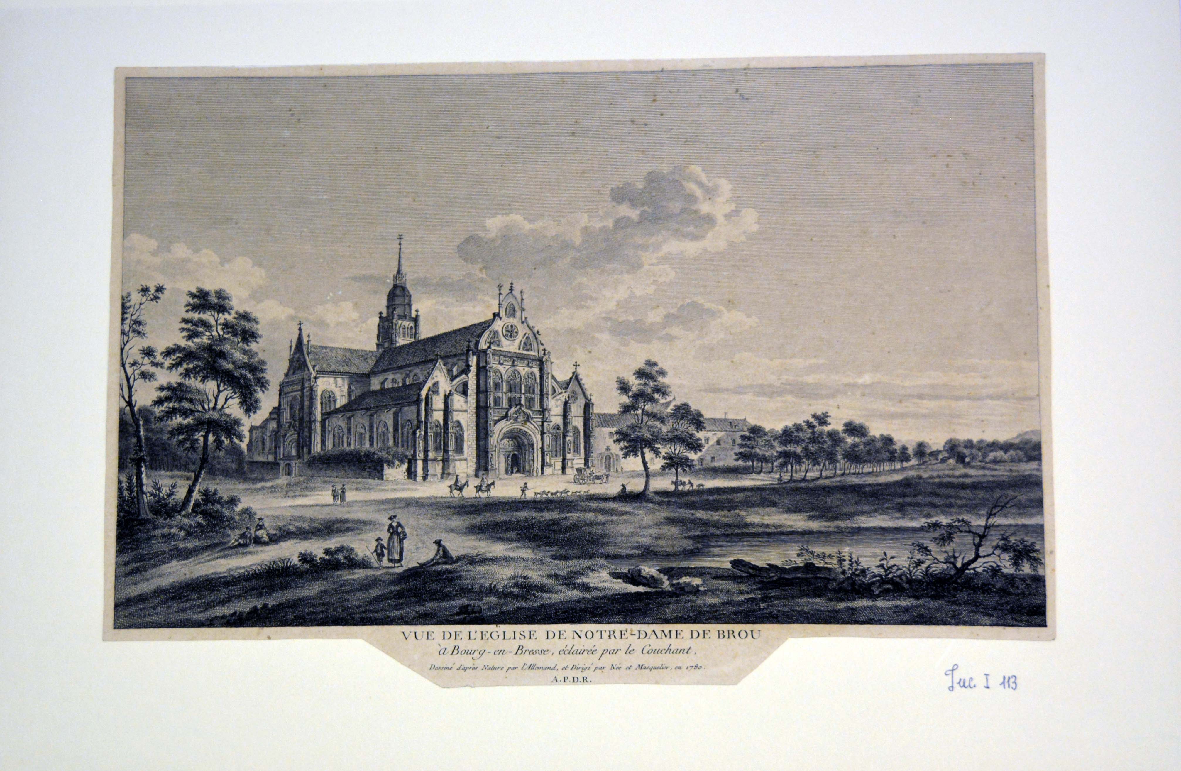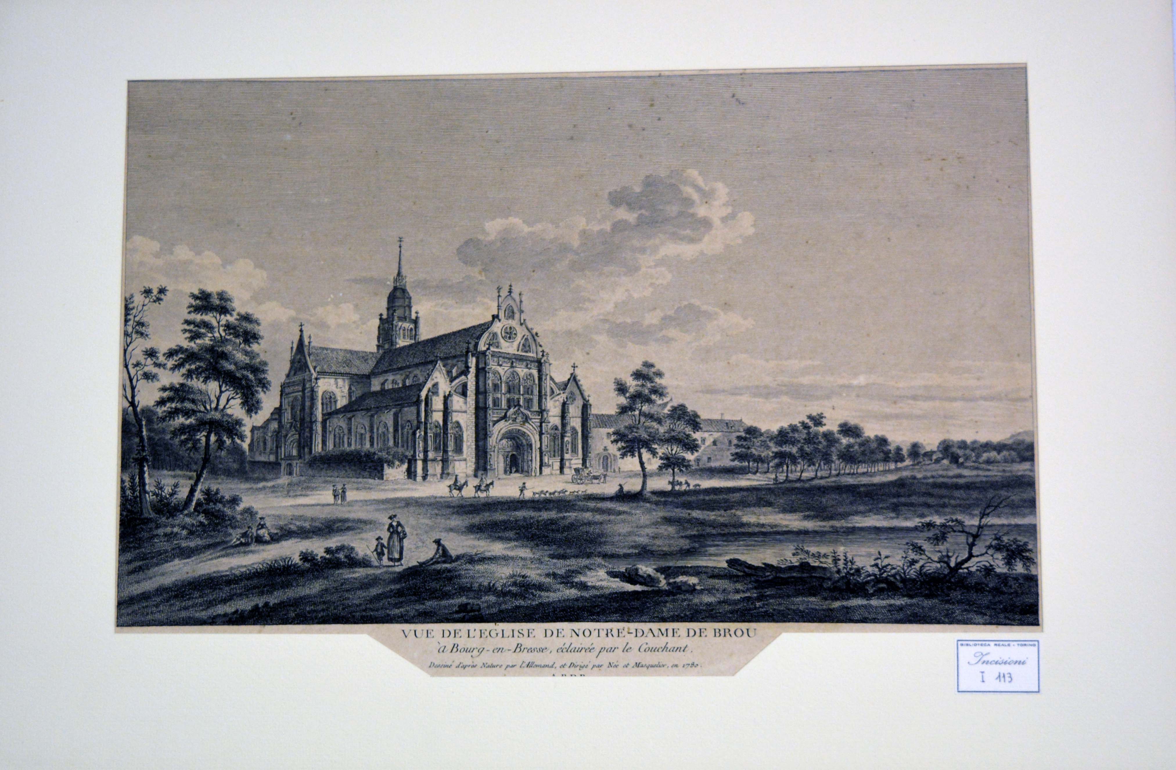 VEDUTA: Bourg-en-Bresse. ARCHITETTURE: Bourg-en-Bresse: chiesa di Notre-Dame de Brou. COSTRUZIONI: chiesa; convento. PAESAGGIO: campi; alberi. FIGURE: uomini; donne; contadini.. ANIMALI: cavalli; cani. MEZZI DI TRASPORTO: carrozza. FENOMENI NATURALI: tramonto