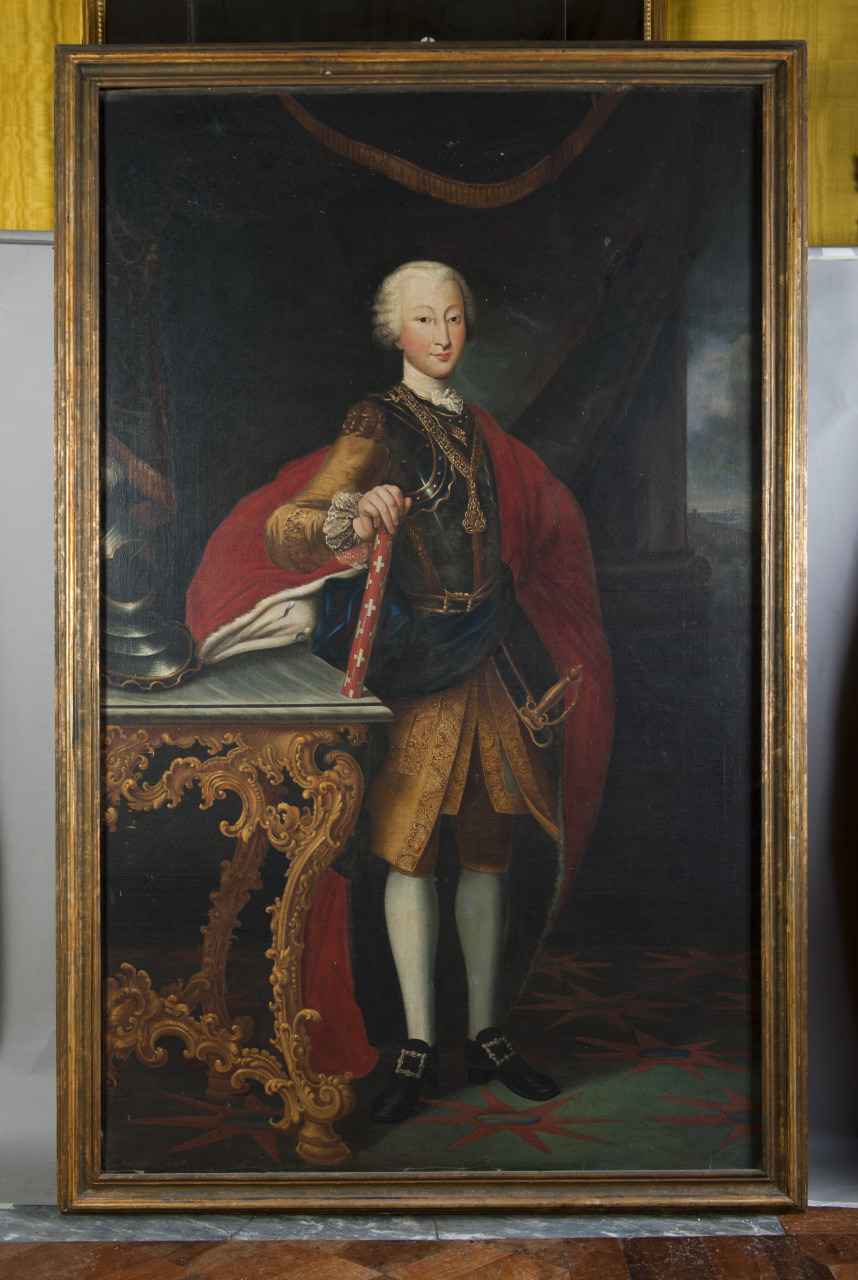 Ritratto in piedi a figura intera, testa quasi di fronte, con corsaletto, camicia bianca con jabot, collare dell'Ordine della SS. Annunziata, abito ricamato su fondo giallo, manto rosso foderato d'ermellino, fascia azzurra all'addome, brache, calze bianche e scarpe con fibia. La mano destra tiene lo scettro con croci, che è appoggiato sopra un tavolo sul quale è posato anche l'elmo. L'altro braccio, appoggiato al fianco, è celato sotto il manto rosso. Il ritratto è ambientato in un interno, si intravede un'apertura paesaggistica sullo sfondo a destra oltre una colonna. Cornice di legno dorato, con qualche caduta della doratura