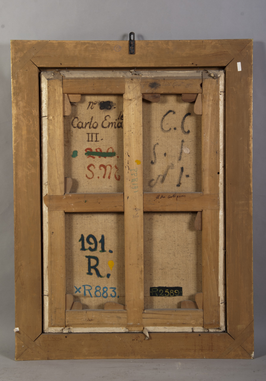 Ritratto maschile, a 3/4 circa di figura, testa quasi di fronte, in abito rosso con ricami in oro e camicia di pizzo chiara. Sopra l'abito indossa un corsaletto di corazza con finiture in oro, il collare dell'Ordine della SS. Annunzaita e una sciarpa azzurra legata ai fianchi. La mano sinistra sul fianco. Sul tavolo, ricoperto di damasco, è poggiato un cuscino su cui si trova la corona reale. Cornice in legno intagliata sui profili interni ed esterno e dorata