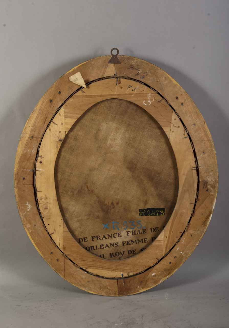 Ritratto femminile a 1/2 figura, testa quasi di fronte, in abito di broccato a fondo giallo guarnito di preziosi e pizzo con scollo ampio e maniche a 3/4, manto rosso foderato d'ermellino. La mano sinistra sul petto nell'atto di sostenere una perla a goccia, mentre l'altra non è più visibile forse a causa di una decurtazione perimetrale subita dal dipinto. Cornice di legno dorato