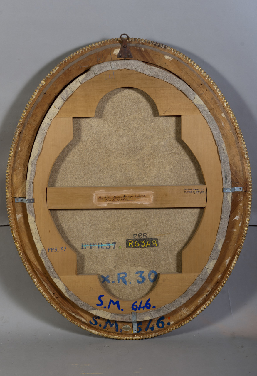 Ritratto maschile in piedi a circa a 3/4 di figura, testa quasi di fronte con parrucca chiara e legata da un nastrino nero. Indossa una divisa militare blu con bottoni e bordi rossi ricamati in argento, adorna di spalline, del collare dell'Ordine della SS. Annunziata e della croce Mauriziana. Sotto l'uniforme porta un abito di colore giallo con fascia in vita e la spada al fianco sinistro. La mano destra è in atto di mostrare il castello rappresentato nello sfondo, che è probabilmente quello Reale di Aglié. Cornice di legno intagliato e dorato