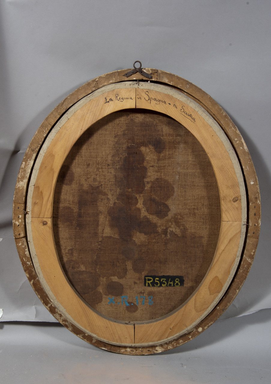 Ritratto femminile in piedi, a 3/4 circa di figura, testa quasi di fronte con acconciatura alta. Indossa un abito probabilmente grigio ricamato in oro, guarnito di pizzo e impreziosito da gioielli cuciti sulla manica e sulll'attaccatuta del corpetto alla gonna. Porta un manto azzurro sulla spalla destra e tiene il braccio sinistro lungo il corpo. Cornice di legno dorato con una rottura in basso e piccoli ammanchi e cadute della doratura in vari punti
