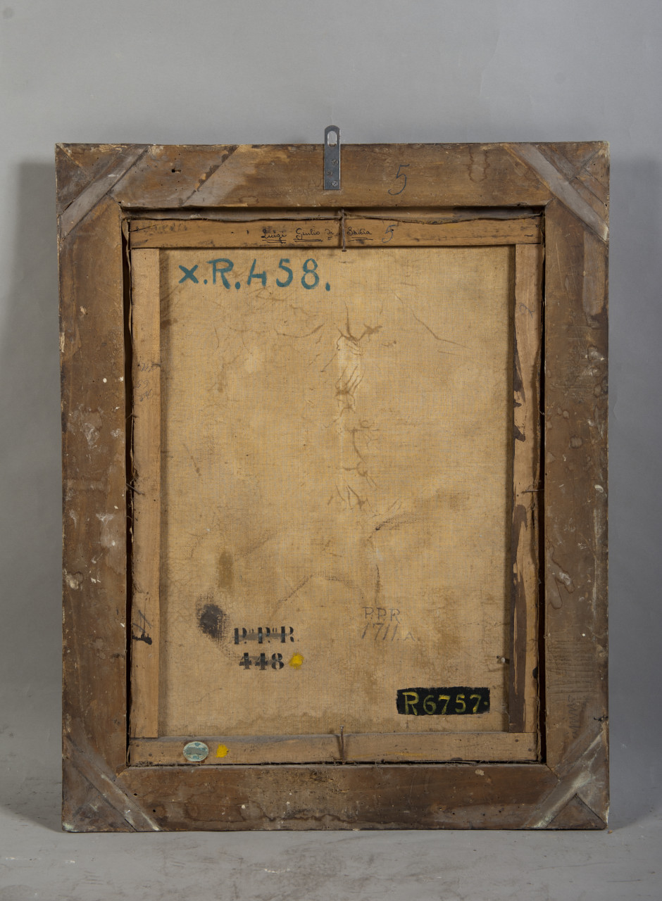 Ritratto maschile a 1/2 figura, testa rivolta leggermente verso destra con lunga parrucca chiara. Indossa una corazza con profili aurei e azzurri e una camicia chiara. Cornice di legno dorato e intagliato con parziali cadute della doratura e preparazione rossa a vista