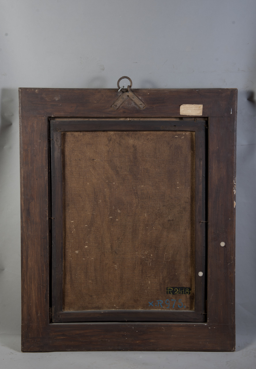 Ritratto maschile in piedi a 3/4 di figura, testa leggermente volta verso sinistra con parrucca chiara. Indossa una divisa militare scura con risvolti rossi e bottoni dorati, adorna di spalline con il collare e la placca dell'Ordine della SS. Annunziata, un abito bianco e uno jabot di voile al collo. Porta la spada al fianco sinistro, tiene la mano destra appoggiata sul tavolo e l'altra è nell'atto di indicare un piccolo oggetto appoggiato sul tavolo che è parte di un modellino, probabilmente militare. Cornice di legno intagliato e dorato