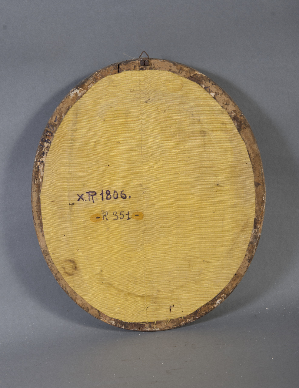 Ritratto ad ago pittura di formato ovale con cornice in legno riccamente intagliato e dorato. La nobile figura maschile è ritratta a mezzo busto. Sull'abito indossa il petto di un'armatura brunita e dorata. La figura parrebbe avvolta in un manto azzurro, foderata in ermellino