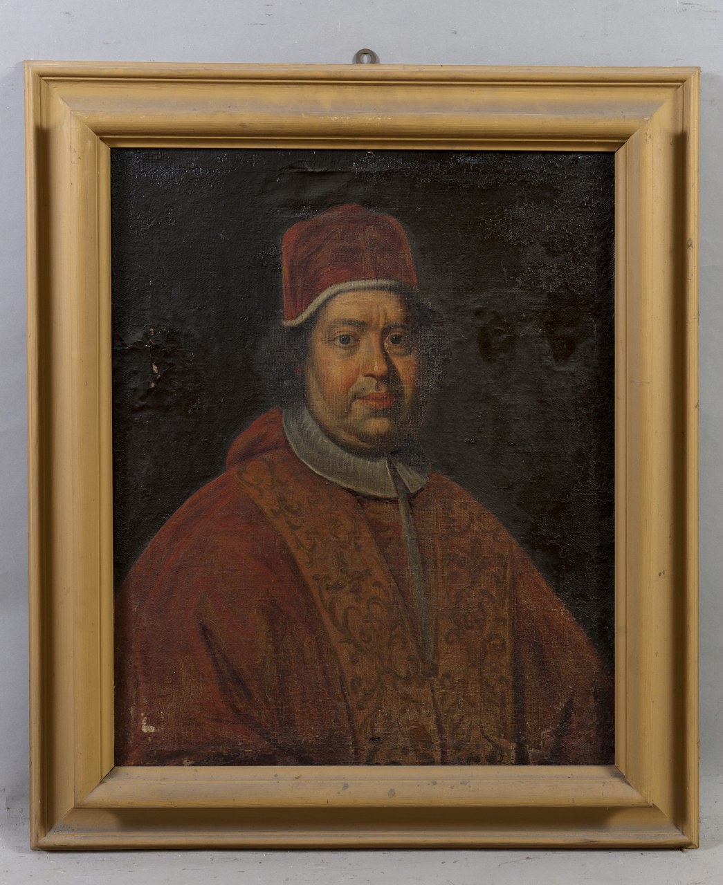 Dipinto ad olio su tela di formato rettangolare con cornice in legno intagliato e dipinto in giallo senape. Ritratto di prelato a mezza figura, testa quasi di fronte, con berretta, cappa e stola violacei, colletto bianco
