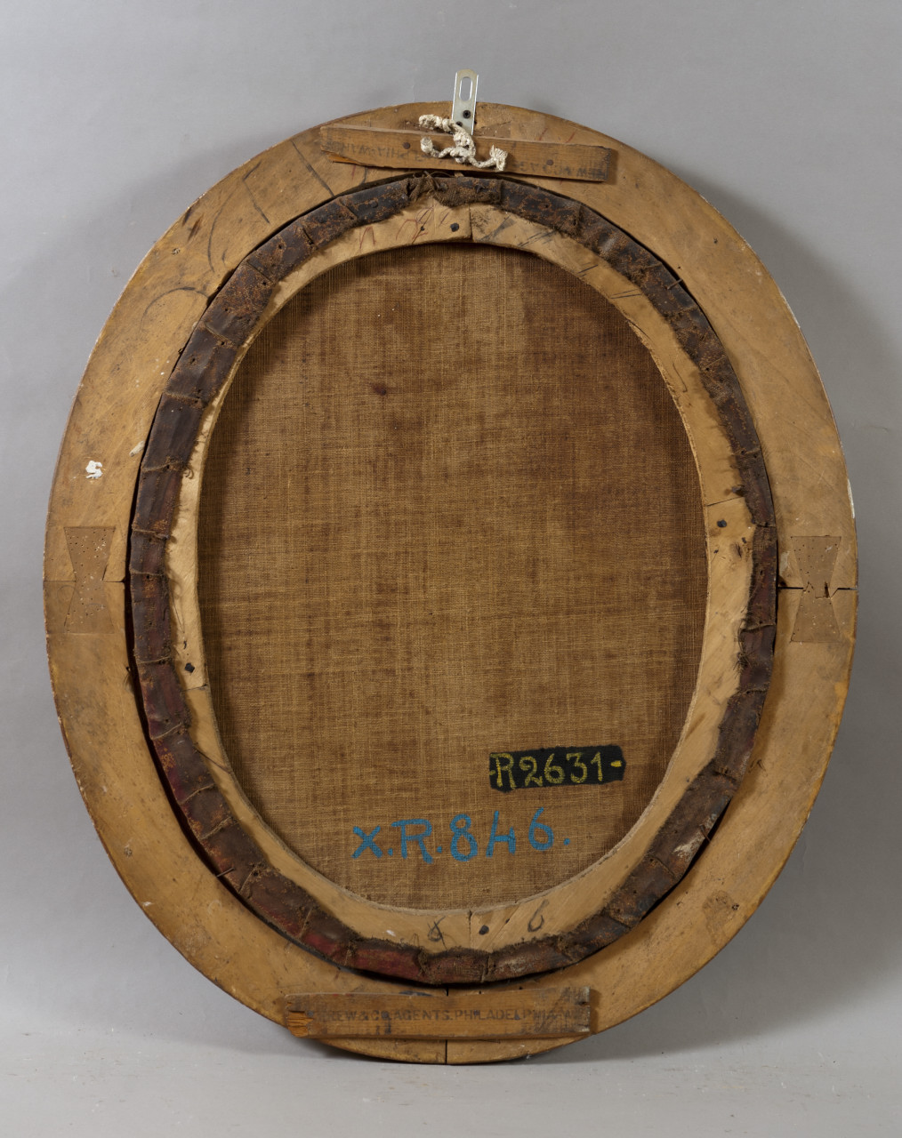 Dipinto ad olio su tela di formato ovale con cornice in legno intagliato e dorato. Polissena Cristina d'Assia Rheinfels è ritratta a 1/2 figura, testa quasi di fronte, in abito grigio ricamato in oro con risvolti azzurri e guarnizioni di preziosi e pizzo. Manto rosso foderato d'ermellino sulle spalle e piuma adorna di prezioso sul capo