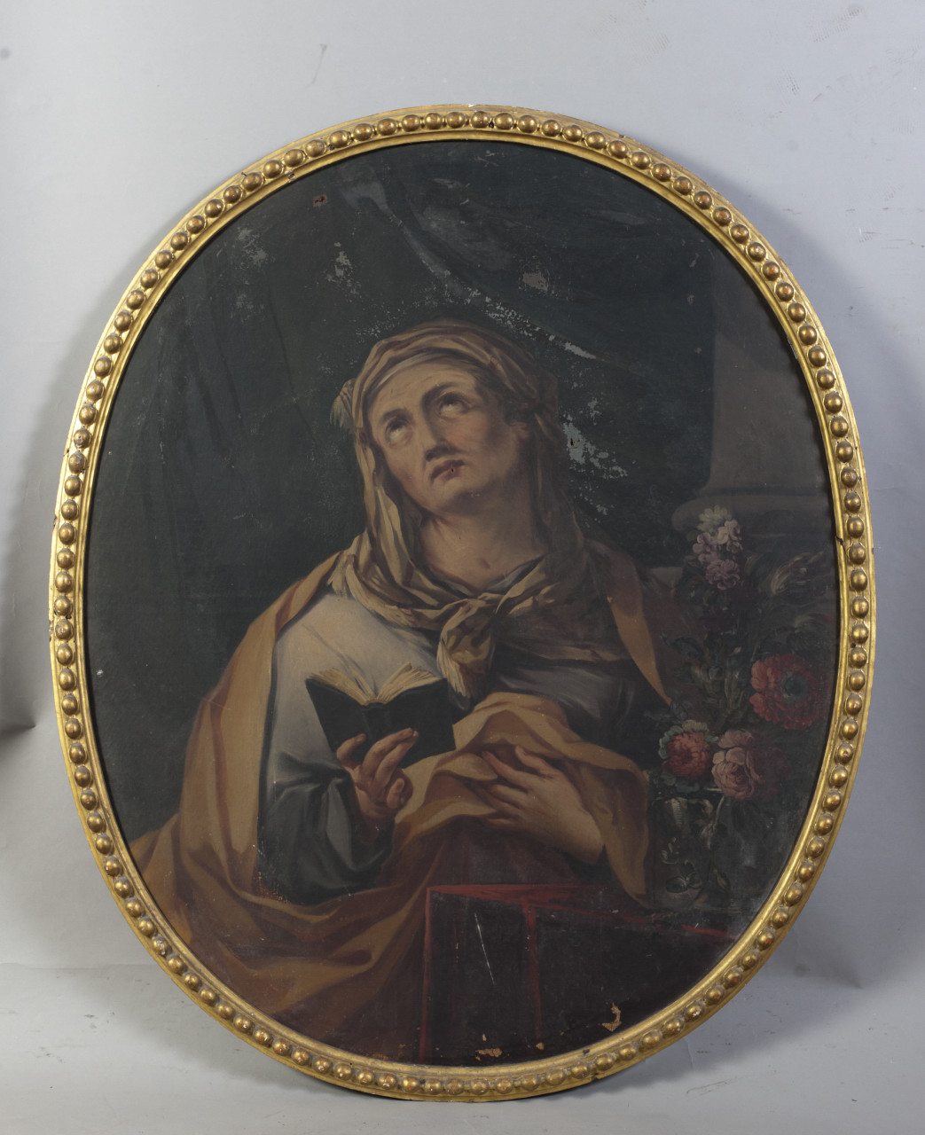- NOTIZIE STORICO CRITICHE Il dipinto, insieme al pendent, raffigurante san Carlo Borromeo in preghiera, per formato, dimensione e tema, l’invito alla preghiera secondo i dettami della “regolata devozione” promossa nella prima metà del Settecento dagli scritti di Ludovico Antonio Muratori, rientra nell’ambito di una produzione sacra destinata alla fruizione privata. L’opera si colloca pienamente, per compostezza della figura e saldezza del disegno, in un indirizzo accademico accadcornemico ed è databile tra il secondo quarto e la metà del XVIII secolo. Più specificatamente, i caratteri del volto della Vergine e le cromie delle vesti, riconducono all’ambito del pittore torinese Michele Antonio Milocco, largamente attivo in Piemonte sino agli anni settanta del Settecento con ampia produzione di soggetti sacri da cavalletto e ad affresco, contraddistinti da una ripetitività dei modelli. Si vedano, per un confronto, a titolo di esempio, le pale di Luserna San Giovanni con I santi Giovanni Battista e San Francesco di Sales in adorazione del SS. Sacramento (1732) oppure l’ovale con l’Educazione della Vergine della chiesa di Santa Teresa di Moncalieri (1738). Il brano di natura morta floreale, non frequente nelle opere documentate dell’artista, potrebbe essere opera della sua seconda moglie, Angela Maria Pitetti detta Palanca nel 1766, specialista nel genere. Tale elemento, permetterebbe di collocare la tela e il suo pendent, più precisamente, alla seconda metà degli anni Sessanta del Settecento
