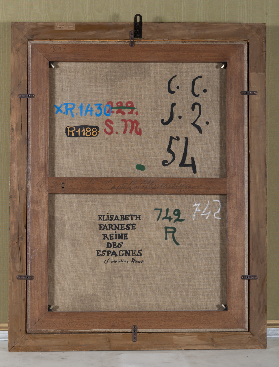 - NOTIZIE STORICO CRITICHE Il dipinto raffigura la regina di Spagna Elisabetta Farnese (Parma, 1692-Aranjuez, 1766), seconda moglie di Filippo V di Borbone (1683-1746) con cui contrasse le nozze nel 1714. Figlia di Edoardo II, duca di Parma e Piacenza, e di Dorotea Sofia di Neuburg, fu personalità di grande determinazione e ambizione che non solo influì sulle scelte di governo della corona iberica, ma anche sulla politica europea della prima metà del XVIII secolo. Il figlio primogenito, Carlo, fu prima re di Napoli e Sicilia e poi re di Spagna; il secondogenito, Filippo, divenne duca di Parma e Piacenza, mentre le numerose figlie andarono in spose ai principali sovrani europei. L’ultimogenita, Maria Antonia Ferdinanda (1729-1785), fu moglie dal 1750 di Vittorio Amedeo III di Savoia. La tela fa parte di un gruppo di dipinti rappresentanti i sovrani e i principi di Spagna della dinastia dei Borbone, originariamente sette e rinvenuti sino ad oggi in numero di cinque, eseguiti dalla pittrice di corte Maria Giovanna Battista Clementi detta la Clementina tra il 1726 e il 1727 per dotarne le residenze sabaude. Oltre al dipinto in oggetto, si conserva a Racconigi anche la tela raffigurante la figlia Maria Anna Vittoria, mentre si trovano in Palazzo Reale a Torino i ritratti di Filippo V (scheda OA 01/00201895) e dell’infante Carlo Sebastiano (scheda 0100202472). E’ stata invece trasferita nel Palazzo Reale di Genova la tela che rappresenta l’infante Filippo (L. Leoncini, Museo di Palazzo Reale di Genova. I dipinti del Grande Appartamento Reale, in Luca Leoncini, Museo di Palazzo Reale di Genova, 2008-2012, vol. I, Milano, pp. 218-219). Come si evince dalle iscrizioni presenti sul retro della tela e dalle numerose indicazioni inventariali, il dipinto in esame venne trasferito dal castello di Moncalieri nel 1903. L’opera, firmata sul retro (sebbene si tratti di una trascrizione seguente ad un rintelo), analogamente alle altre tele del gruppo, risulta essere una replica, con varianti per quanto riguarda lo sfondo, qui semplificato, e il taglio della figura, qui ridotto, dei ritratti della famiglia reale eseguiti a Madrid dal pittore di Filippo V di Borbone Jean Ranc (Montpellier, 1674-Madrid, 1735) negli anni Venti del Settecento. Allievo di Hyacinthe Rigaud, riuscì a soddisfare le esigenze del sovrano che sempre preferì l’indirizzo aulico e attento alla resa del dettaglio della ritrattistica francese, come si può evincere anche dalla assai fedele riproduzione in oggetto, nonostante una certa semplificazione nella resa dei volti. L’opera originale fu ideata quale immagine ufficiale della sovrana, come evidenziato dall’esibizione degli attributi della regalità, mantello e corona, e dalla ricchezza dell’abito e dell’acconciatura