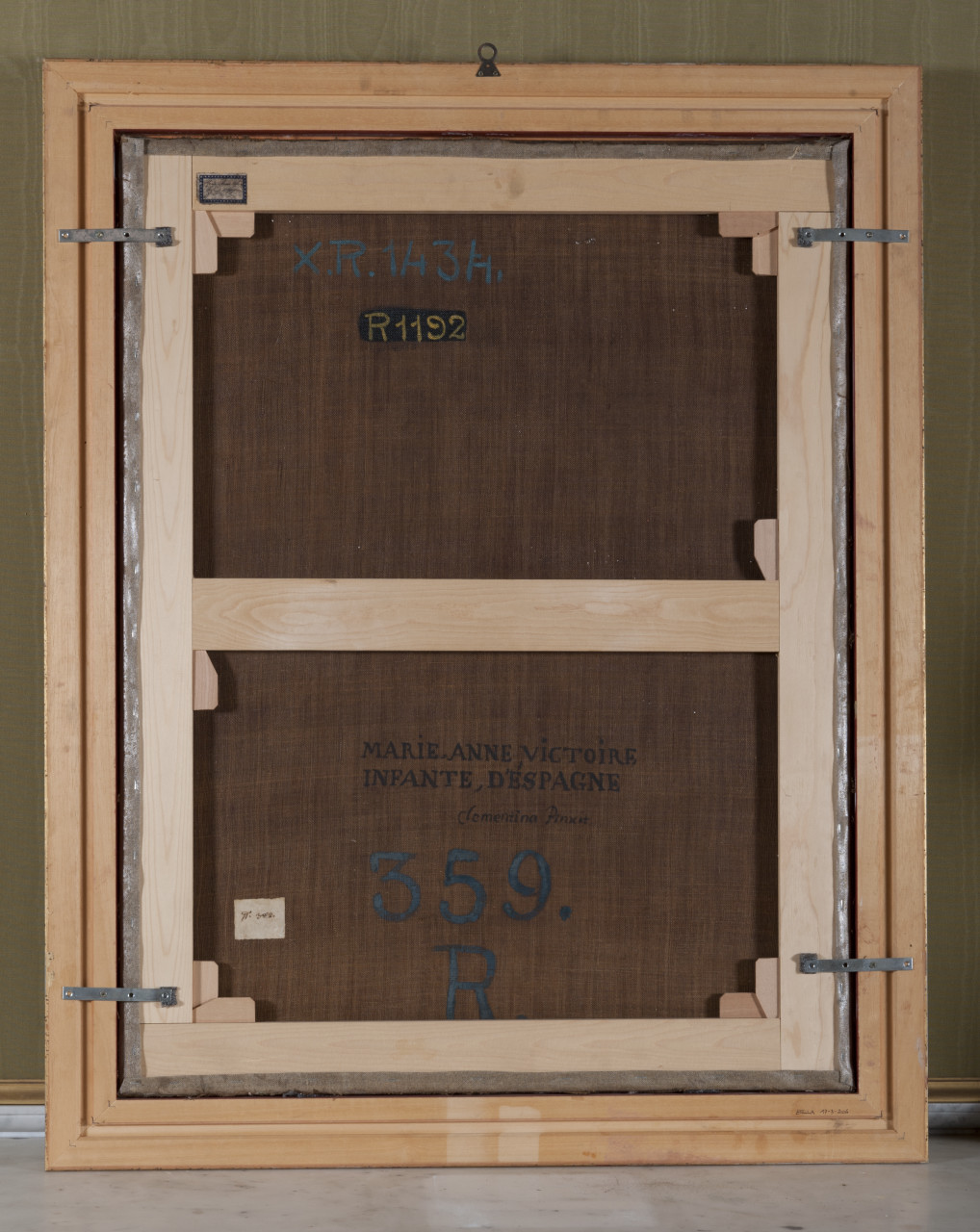 - NOTIZIE STORICO CRITICHE Il dipinto, secondo quanto indicato nell’iscrizione riportata dopo l’intervento di restauro del 2004, rappresenta la terza figlia nata dal matrimonio di Elisabetta Farnese e di Filippo V di Borbone, Marianna Vittoria (Madrid, 1718-Lisbona, 1781). Seguendo gli ambiziosi progetti della madre di imparentamento della nuova dinastia regnante di Spagna con le principali casate europee, dopo un fidanzamento con il cugino primo Luigi XV e un mancanto matrimonio con lo stesso, l’infanta nel 1729 venne data in sposa a Giuseppe I di Braganza, a seguito di due anni di trattative, assumendo il titolo di principessa del Brasile. Nel 1750, con l’ascesa al trono del marito, divenne regina di Portogallo. La figlia Maria fu la prima sovrana donna del regno unito di Portogallo, Brasile e Algarve. Sorella minore di Marianna Vittoria fu l’infanta Maria Antonia Ferdinanda (1729-1785), moglie dal 1750 di Vittorio Amedeo III di Savoia La tela fa parte di un gruppo di dipinti rappresentanti i sovrani e i principi di Spagna della dinastia dei Borbone, originariamente sette e rinvenuti sino ad oggi cinque, eseguiti dalla pittrice di corte Maria Giovanna Battista Clementi detta la Clementina tra il 1726 e il 1727 per dotarne le residenze sabaude. Oltre al dipinto in oggetto, si conserva a Racconigi anche la tela raffigurante la madre, Elisabetta, con provenienza dal castello di Moncalieri, mentre si trovano in Palazzo Reale a Torino i ritratti di Filippo V (scheda OA 01/002018959 e dell’infante Carlo Sebastiano (scheda 0100202472). E’ stata invece trasferita nel Palazzo Reale di Genova la tela che rappresenta l’infante Filippo (L. Leoncini, Museo di Palazzo Reale di Genova. I dipinti del Grande Appartamento Reale, in Luca Leoncini, Museo di Palazzo Reale di Genova, 2008-2012, vol. I, Milano, pp. 218-219). L’opera in oggetto, firmata sul retro (sebbene si tratti di una trascrizione seguente al rintelo), analogamente alle altre tele del gruppo, risulta essere una replica, con minime varianti, dei ritratti della famiglia reale eseguiti a Madrid dal pittore di Filippo V di Borbone Jean Ranc (Montpellier, 1674-Madrid, 1735) negli anni Venti del Settecento. Allievo di Hyacinthe Rigaud, riuscì a soddisfare le esigenze del sovrano che sempre preferì l’indirizzo aulico e attento alla resa del dettaglio della ritrattistica francese, come si può evincere anche dalla assai fedele riproduzione in oggetto, nonostante una certa semplificazione nella resa dei volti. L’opera mostra la giovane principessa in abito da corte con la parrucca ornata di fiori dal valore simbolico, analogamente a quelli che indica nel vaso sulla sinistra, subito dopo il rientro in Spagna a seguito della rottura delle trattative per il matrimonio con il re di Francia