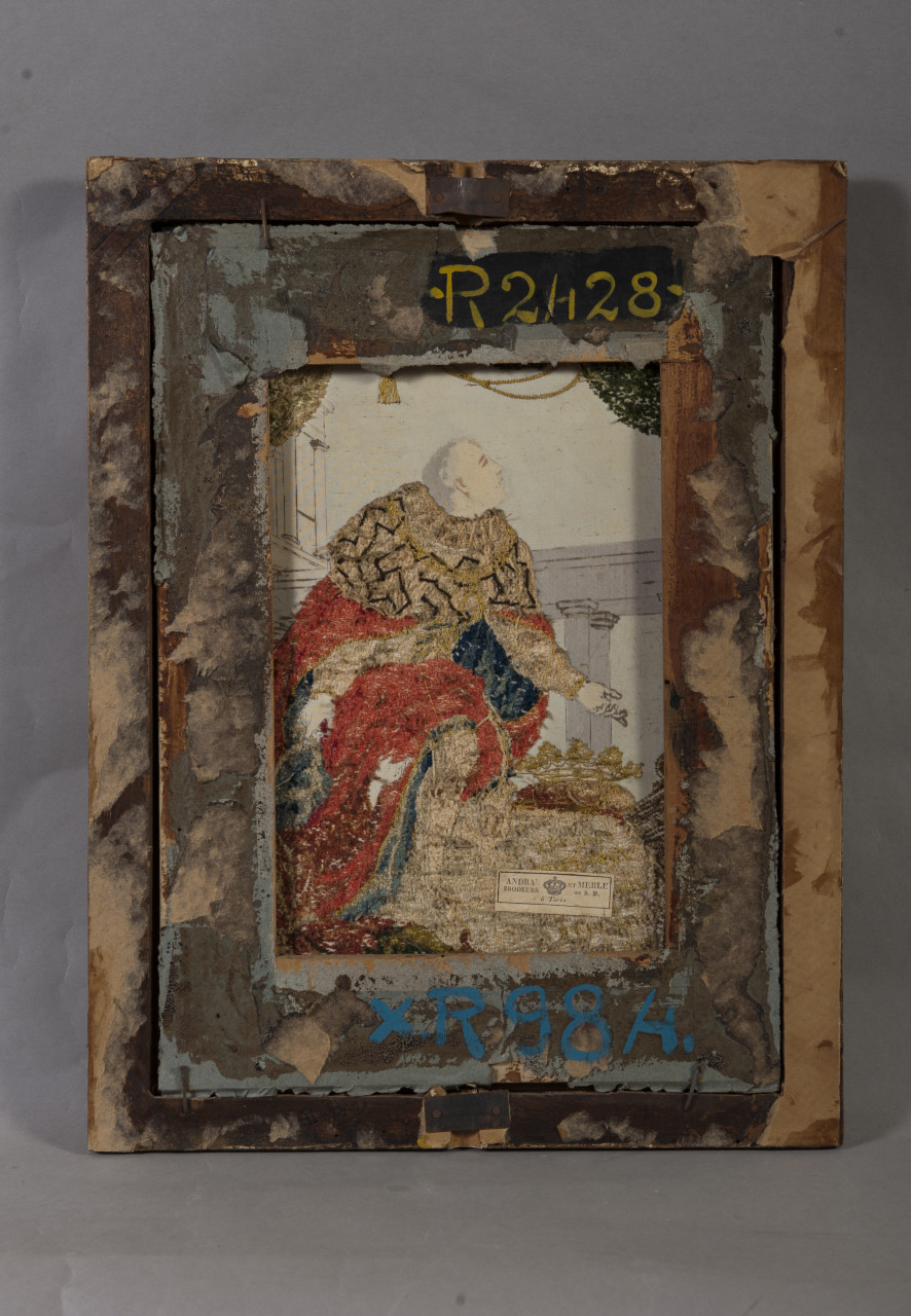 - NOTIZIE STORICO CRITICHE La cornice in cui è contenuto il ricamo presenta solamente contrassegni inventariali relativi alle campagne di catalogazione dei beni del castello di Racconigi. Si deve presumere, pertanto, che l’oggetto sia qui pervenuto per dono o per acquisto durante i decenni in cui il principe di Piemonte, e poi ultimo re d’Italia, Umberto II raccolse in questa sede le sue collezioni pittoriche, primariamente dedicate all’iconografia e alla storia sabauda, come nel caso in esame. La stampa, infatti, come sottolineato dall’iscrizione, rappresenta il duca Amedeo IX di Savoia (Thonon-les-bains, 1435-Vercelli, 1472), beatificato nel 1669. La peculiarità dell’oggetto che abbina ricamo e pittura, è propria di manufatti apprezzati dal XVIII al principio del XX secolo, magari di produzione conventuale. La teatralità che contraddistingue la scena, come denotano i vistosi tendoni, l’accuratezza della architettura e i caratteri dei volti, inducono a ipotizzare un riferimento a modelli della seconda metà del XVIII secolo in ambito piemontese dove la devozione al duca ebbe li suo baricentro per tutto il secolo e oltre. L’etichetta presente sul retro indica la produzione a Torino dalla manifattura di Andrà et Merle; in assenza di riscontri bibliografici e considerando la tipologia di etichetta, l’opera potrebbe collocarsi in fase di prima Restaurazione tra il secondo e il terzo decennio dell’Ottocento