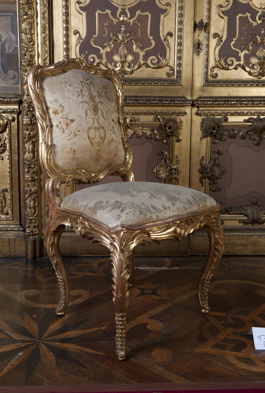 • NOTIZIE STORICO CRITICHE La sedia fa parte di una serie di 24, proveniente dal Palazzo Reale di Genova, ed è stata realizzata in ambito ligure verso la metà del XVIII secolo. L'imbottitura della seduta e dello schienale si deve invece alla manifattura tessile torinese Chiantore e Rapallino nel 1898