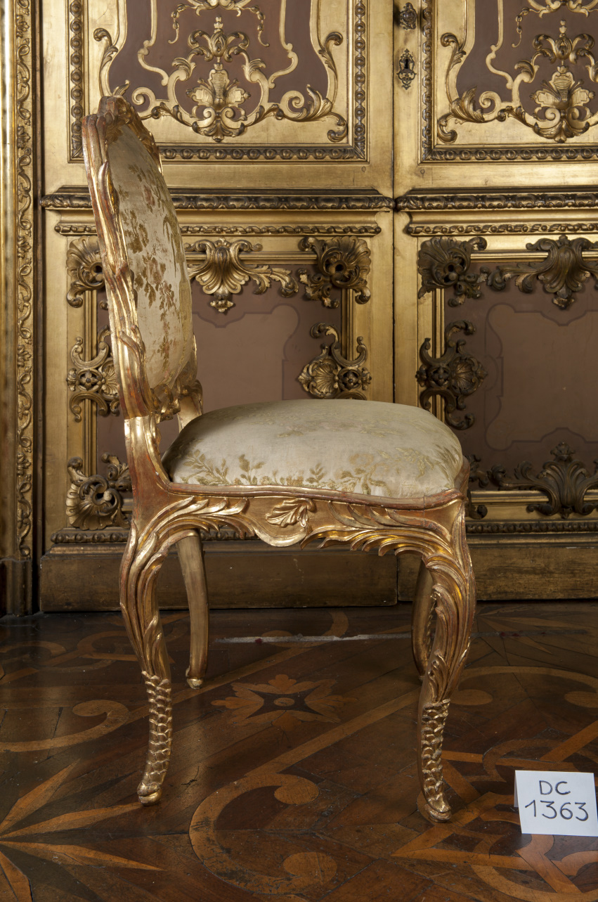 - NOTIZIE STORICO CRITICHE La sedia fa parte di una serie di 24, proveniente dal Palazzo Reale di Genova, ed è stata realizzata in ambito ligure verso la metà del XVIII secolo. L'imbottitura della seduta e dello schienale si deve invece alla manifattura tessile torinese Chiantore e Rapallino nel 1898