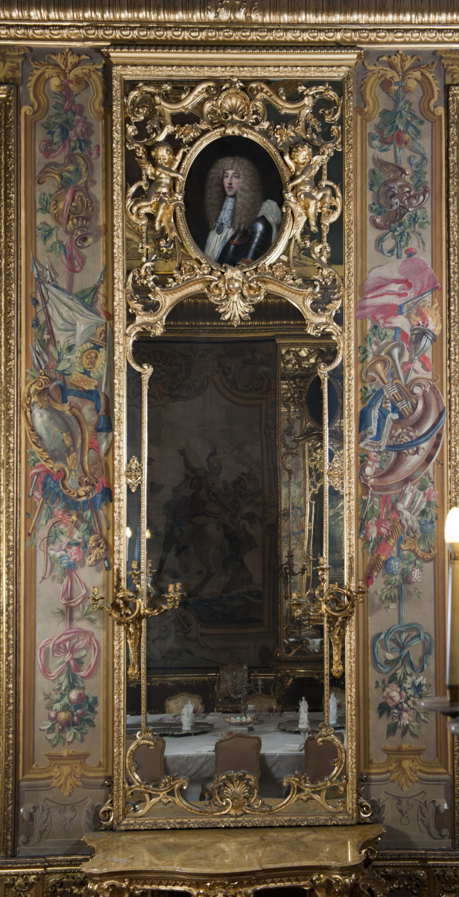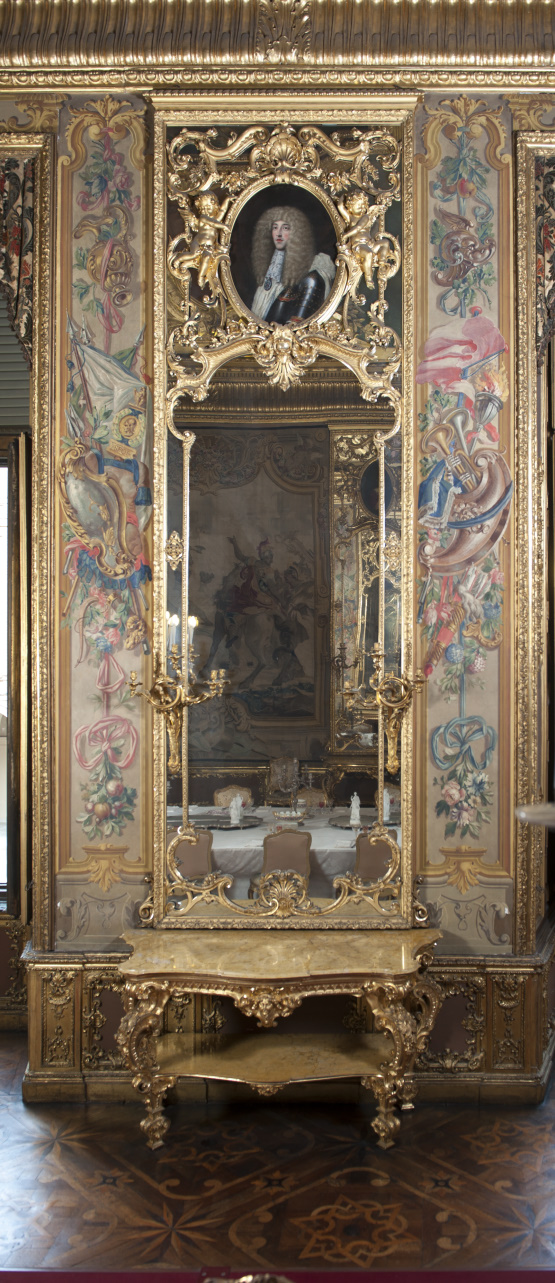Specchiera composta da grande specchio entro cornice riccamente intagliata con battuta della cornice e decorazione mistilinea. Reca in alto e in basso un motivo composto da foglie stilizzate. Una palmetta volta verso l'alto con perle è posizionata al centro della parte inferiore, mentre alla cimasa si trova una foglia aperta rivolta verso il basso. Al centro della parte superiore è collocato un dipinto entro una cornice di forma ovale sorretta da due putti alati, a sua volta circondata da serti vegetali e decorata alla sommità con un motivo a conchiglia