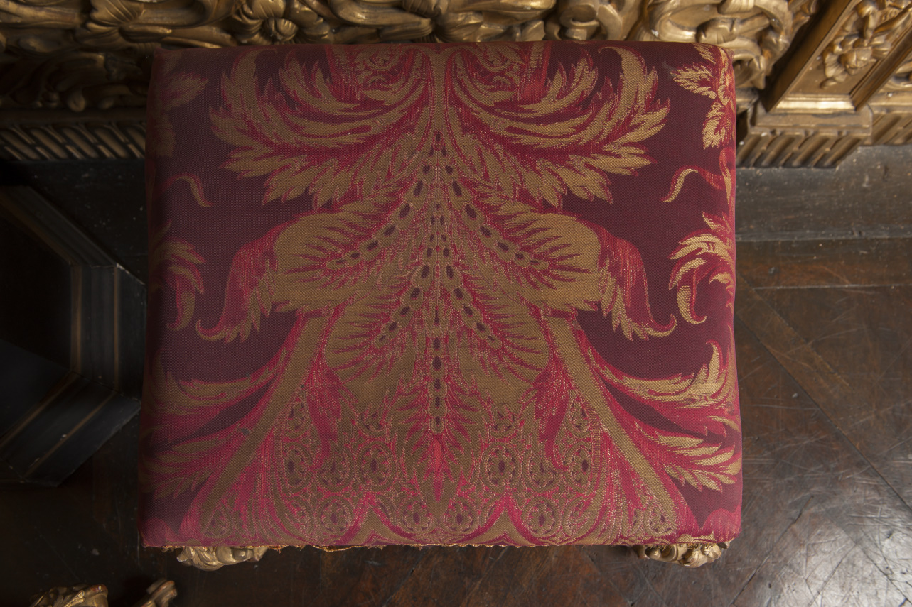 Sgabello di forma rettangolare con piedini a voluta e gambe raccordate da crociere di unione. La carpenteria è finemente intagliata e dorata con una decorazione combinata di nervature, a volute e a fogliami, soprattutto nella crociera dove si trovano motivi a conchiglia e a fiore. L'imbottitura della seduta è di colore rosso con damascature oro