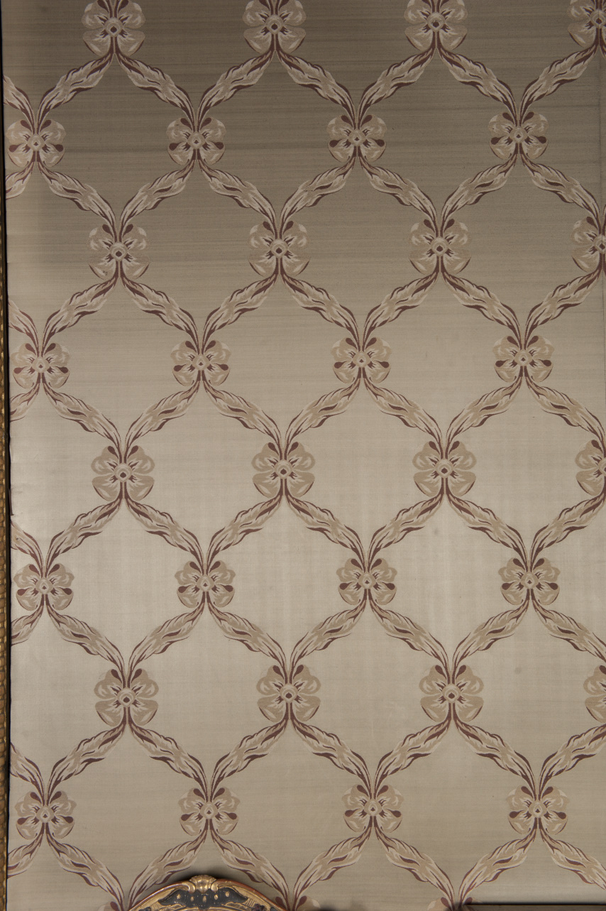 Parato in seta di colore rosa pallido, decorata a nastri e fiocchi intrecciati in rosa più scuro
