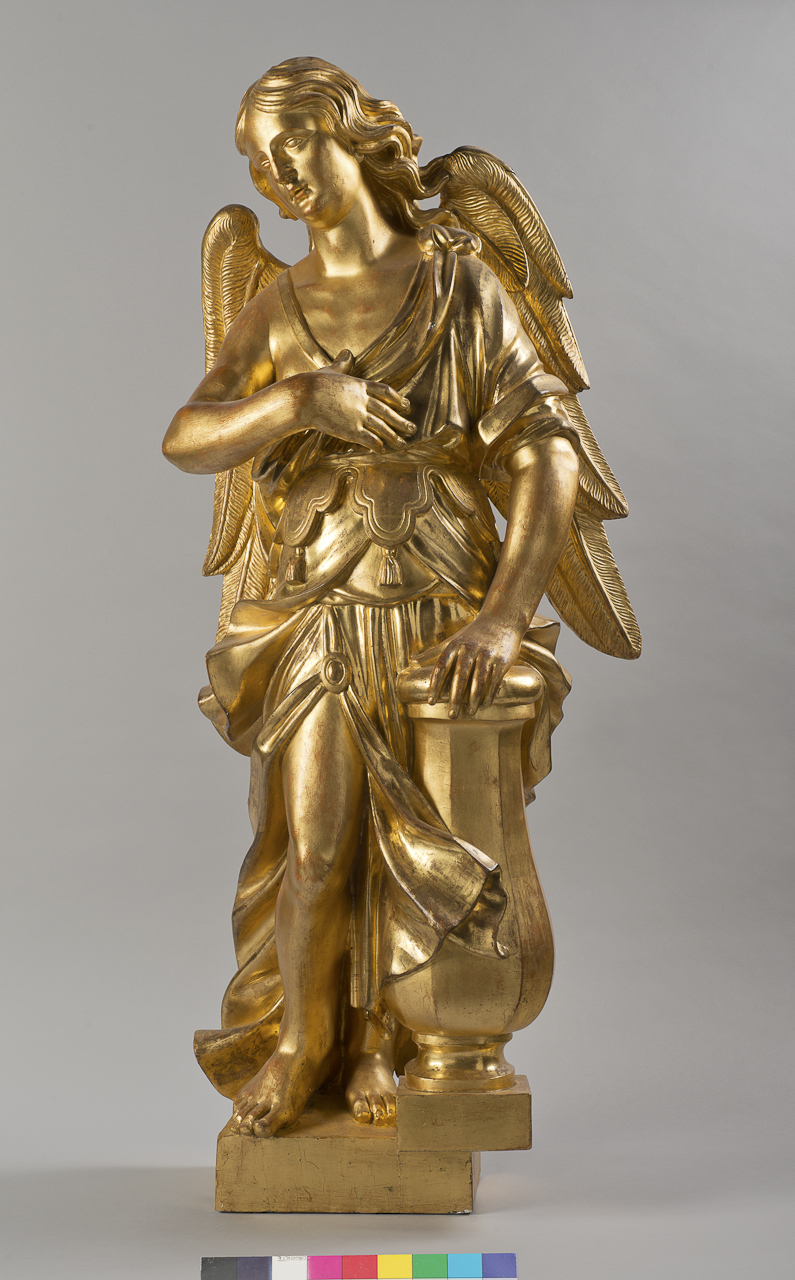 Scultura in legno intagliato e dorato raffigurante un angelo con i simboli della Passione (colonna)