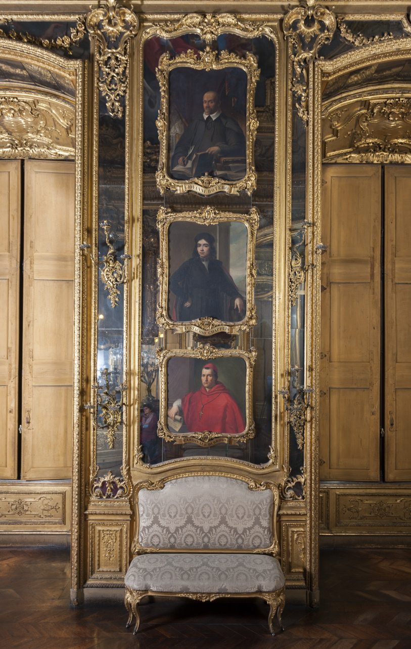 - NOTIZIE STORICO CRITICHE Tra il 1742 e il 1749 la Galleria del Daniel fu oggetto di un totale riallestimento su progetto del primo architetto di corte Benedetto Alfieri. Esso prevedeva un rivestimento delle pareti con ricca boiserie, secondo uno stile di maturo rococò, con partiti decorativi a intaglio, specchi, sovrapporte e cornici atte ad ospitare i dipinti della quadreria regia. L’assetto di ciascuna specchiera previde, secondo canoni di calcolata simmetria, la presenza di una serie di “punti luce” sotto forma di appliques di diversa misura (due, tre, quattro e cinque bracci), disposte in corrispondenza della fascia inferiore e mediana dei dipinti. Le appliques furono eseguite in bronzo dorato, seguendo il modello creato dal regio scultore e fonditore Francesco Ladatte nel 1748. Il raffinato disegno dall’andamento serpentinato, seguendo così quella ideale “linea della bellezza” teorizzata pochi anni dopo (1753) da William Hogarth, prevedeva la varietà non solo nella forma della parte fissata al muro, ornata da un collaudato repertorio di motivi floreali e pelacette, ma anche nella disposizione e posizionamento di ciascun braccio, rendendo, di fatto, quasi unica nella propria struttura ogni applique. La numerazione relativa alla sequenza inventariale (1880, 1908, 1966) è stata attribuita arbitrariamente all’esemplare in oggetto, dal momento che i numeri indicati negli inventari, forse apposti sul retro di esso, non sono visibili ad una osservazione frontale e senza smontare l'opera della sua collocazione