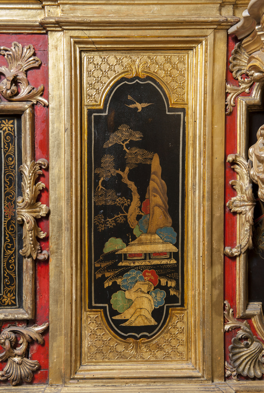 - NOTIZIE STORICO CRITICHE L’assetto odierno della sala rispecchia essenzialmente quello descritto dagli inventari della residenza di fine Ottocento-inizio Novecento, pur con varianti per quanto attiene ai tendaggi e ai punti luce affissi alle pareti. Realizzata interamente su progetto di Filippo Juvarra (1732-33), anche se in buona parte i lavori furono compiuti dopo la sua partenza da Torino negli anni 1735-1737, la sala rientra negli ambienti dei nuovi appartamenti che il re di Sardegna Carlo Emanuele III volle far allestire per sé e per la seconda consorte, Polissena d’Assia, subito dopo la sua salita al trono nel 1730 e che, di fatto, furono ultimati in occasione delle nozze con la terza consorte, Elisabetta Teresa di Lorena. Sino all’età di Carlo Alberto, questo spazio fu denominato Gabinetto di Toeletta della Regina. A seguito delle trasformazioni operate in tutto il piano nobile del Palazzo sotto la regia di Pelagio Palagi, pur preservato, a differenza di alcuni ambienti contigui che furono radicalmente trasformati nelle funzioni d’uso, nella decorazione e nell’arredo, esso venne inglobato nell’appartamento destinato al sovrano e assunse l’attuale denominazione. Capolavoro nella ideazione degli allestimenti di interni del Messinese, benché manchino specifici disegni progettuali, il Gabinetto Cinese testimonia in maniera compiuta nella principale residenza della corte sabauda, grazie alla presenza di pannelli originali in lacca affissi alle pareti, quel gusto per l’esotismo settecentesco europeo che venne declinato, specialmente nella prima metà del Settecento, a favore della “moda cinese” anche nell’arredo mobile coevo, lavoro di maestranze specializzate torinesi e ticinesi. La decorazione pittorica della volta con Il Giudizio di Paride fu affidata al primo pittore di corte, Claudio Francesco Beaumont (1735-37). Al fine di completare la decorazione delle pareti del Gabinetto di Toeletta, caratterizzata da una serie di pannelli originali di provenienza cinese, si commissionarono tra il 1736 e il 1737 a Pietro Massa una serie di tavole a imitazione delle originali “in vernice alla China”. Esse furono posizionate in aree di minore rilevanza nella sala e dove non era possibile una visione ravvicinata delle opere: lungo il lambriggio, negli sguinci delle finestre e sulle ante delle stesse, oltre che nella porzione più alta delle pareti. Massa si specializzò in questo tipo di produzione al punto da essere citato nelle note di pagamento dell’Amministrazione della Real Casa come “pittore alla Chinese”. Nulla si conosce della sua formazione; è documentato al servizio della corte sabauda dal 1721 sino a tutto il sesto decennio del XVIII secolo, operando nelle diverse residenze sabaude per l’ammodernamento degli appartamenti secondo il gusto internazionale per l’esotismo. La scena di paesaggio rappresentata potrebbe essere desunta direttamente dai pannelli originali, o da altre fonti, ad esempio i motivi presenti sulle porcellane, contestualmente importate da Cina e Giappone, o da repertori a stampa, combinando insieme anche elementi di fantasia elaborati dall’artista. I soggetti dei pannelli laterali del lambriggio sono orientati specularmente rispetto a un pannello centrale di maggiori dimensioni centrale. Le cornici di garbato gusto rocaille che profilano ciascun pannello furono intagliate tra il 1736 e il 1737 da Giovanni Luigi Bosso e da Pietro Giuseppe Valle, due professionisti ripetutamente attivi nella residenza torinese tra il quarto e il quinto decennio del XVIII secolo. I pannelli, analogamente alle cornici entro cui sono montati, essendo considerati arredo “fisso” della sala sono privi di numeri di inventario nelle ricognizioni patrimoniali del 1880, 1908 e 1966. Anche nei “Testimoniali di Stato” che, di norma, restituiscono l’aspetto e lo stato conservativo di infissi, volte, pavimenti e altri elementi non asportabili senza un intervento specifico professionale, non menzionano i pannelli in modo significativo
