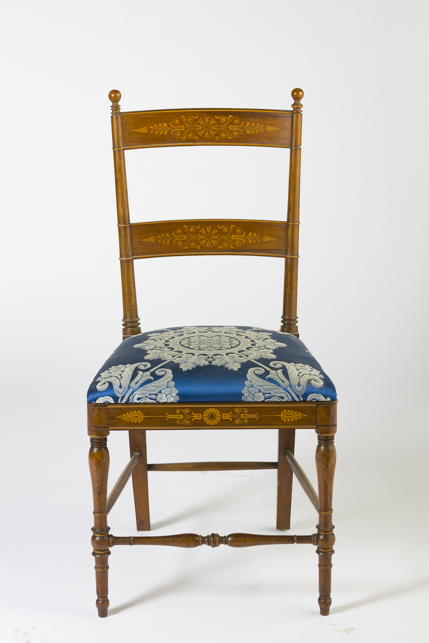 Sedia in legno mogano intarsiato di spiniero con disegni a foglie. La spalliera presenta due fasce;le gambe anteriori e le traverse sono tornite; il sedile mobile è imbottito e ricoperto di seta di colore azzurro oltremare, operata con un grande rosone e con racemi di colore bianco