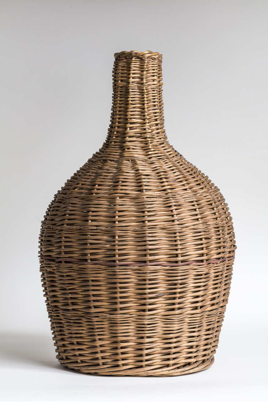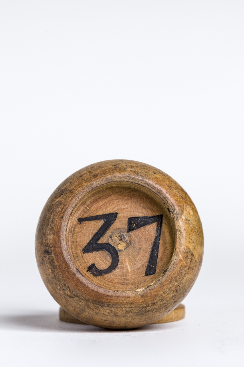 Recipiente di vimini a forma di bottiglia, contenente 40 numeri disegnati su legno di bossolo
