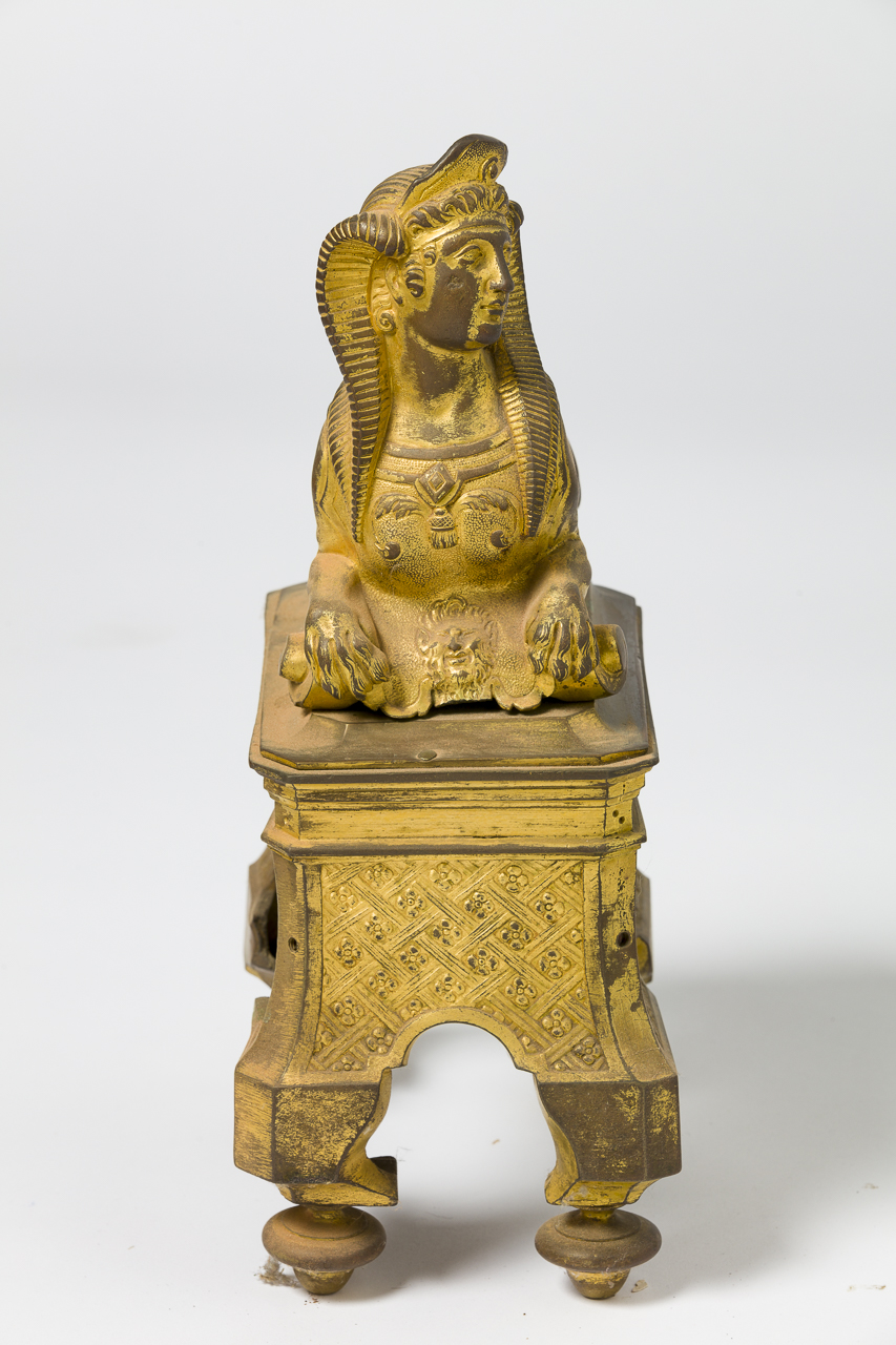 Alare in bronzo dorato, elemento di una coppia. Poggia su piccoli piedi di forma circolare ed ha una base decorata con un motivo ad intreccio sul quale spicca, nella parte frontale, uno stemma coronato con gli emblemi dei Savoia e degli Orléans. Nella parte superiore è accucciata una sfinge