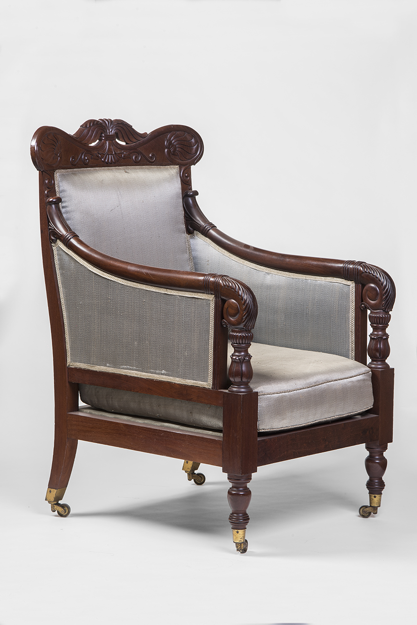 Poltrona a braccioli in legno imbottita, recante due cuscini mobili sulla seduta. Poggia su quattro gambe di cui quelle anteriori sono tornite e quelle posteriori lisce e arcuate all'indietro. Terminano con rotelline in bronzo dorato. La zona del poggiamano è intagliata con un motivo a foglie. I braccioli hanno andamento curvilineo. La traversa superiore dello schienale è decorata con palmette intagliate che sui lati conferiscono un andamento arrotondato agli spigoli della traversa stessa