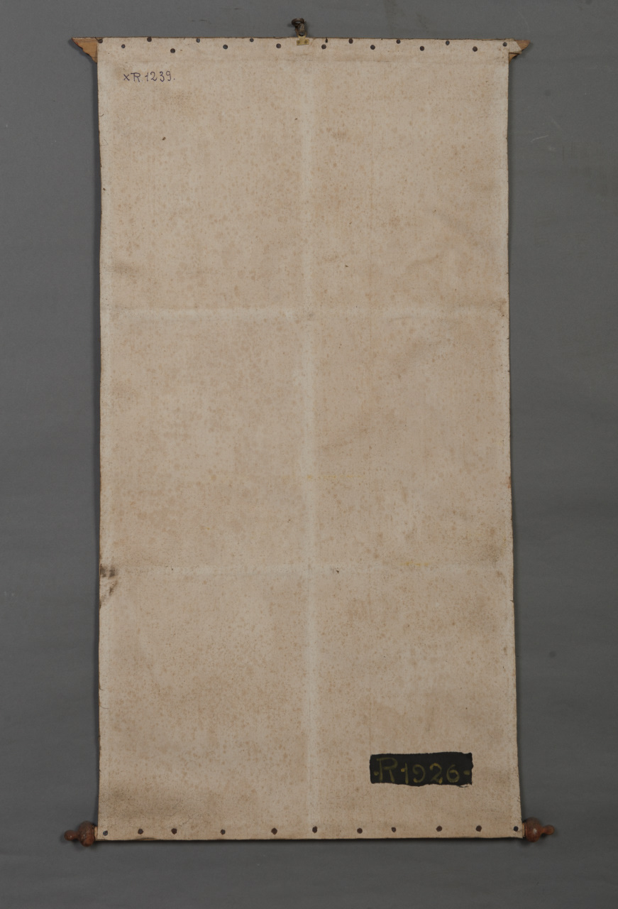 Composizione di sei stampe. Il supporto in carta telata è dotato di listello superiore modanato e fornito di attaccaglia, e anima inferiore in legno, fissati con chiodini posteriormente. Le incisioni acquerellate, incorniciate da nastro giallo incollato sul recto, raffigurano ciascuna un personaggio in costume spagnolo, a figura intera, su sfondo accennato, accompagnato da didascalia bilingue