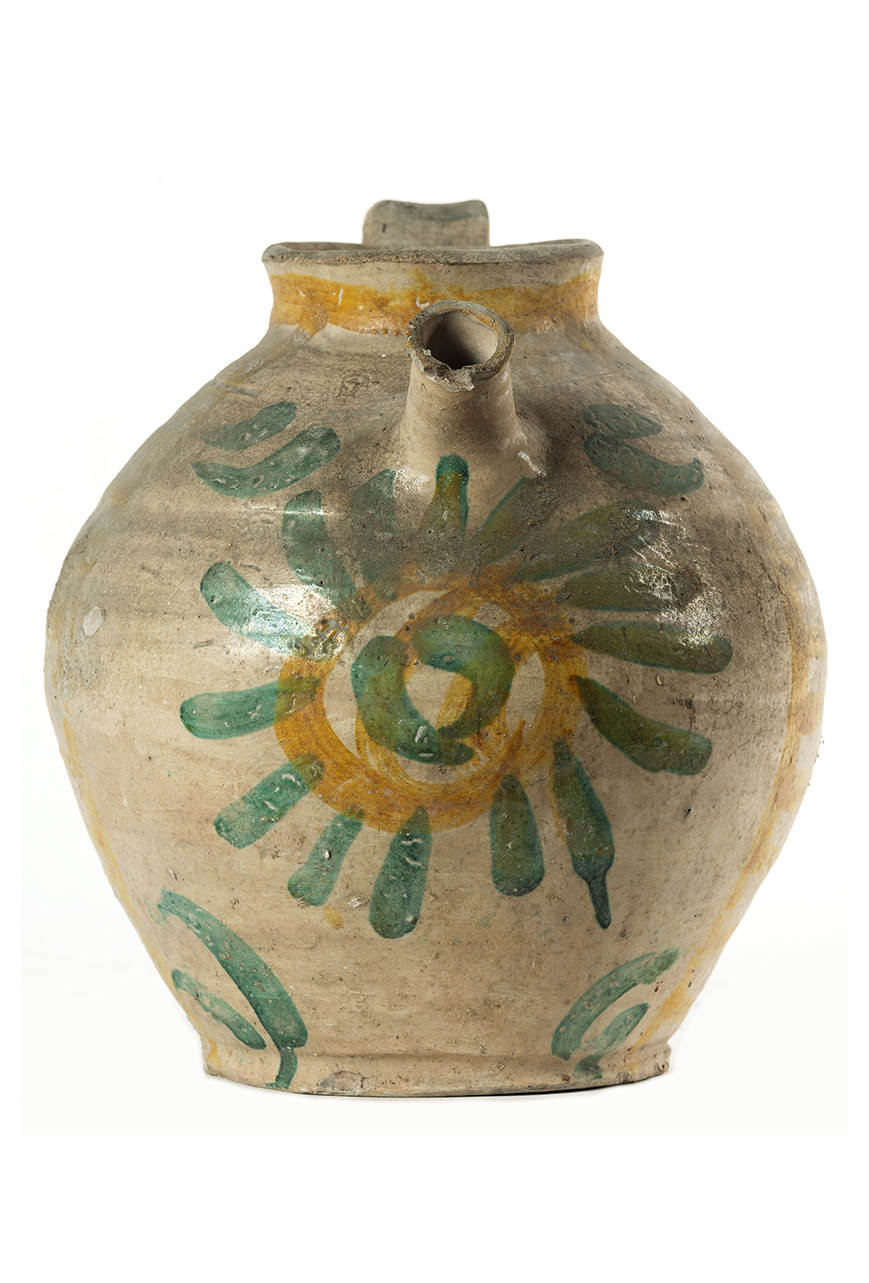 Corpo globulare su piede molto basso, imboccatura con orlo tagliato a stecca su collo evidente, pippio cilindrico e ansa a nastro. Decorazione con un sole stilizzato, linee verticali e orizzontali gialle, linea mossa verde su fondo bianco