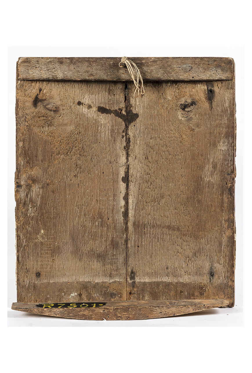 Scena dell’Annunciazione: a sinistra l’angelo, che reca i gigli nella mano sinistra e indica il cielo con il braccio destro levato, a destra la Vergine appoggiata ad un inginocchiatoio ed avvolta da un manto disegnato di stelle dorate china il capo. In alto è raffigurato Dio con la mano destra benedicente e un globo nella sinistra, rivolto verso la donna