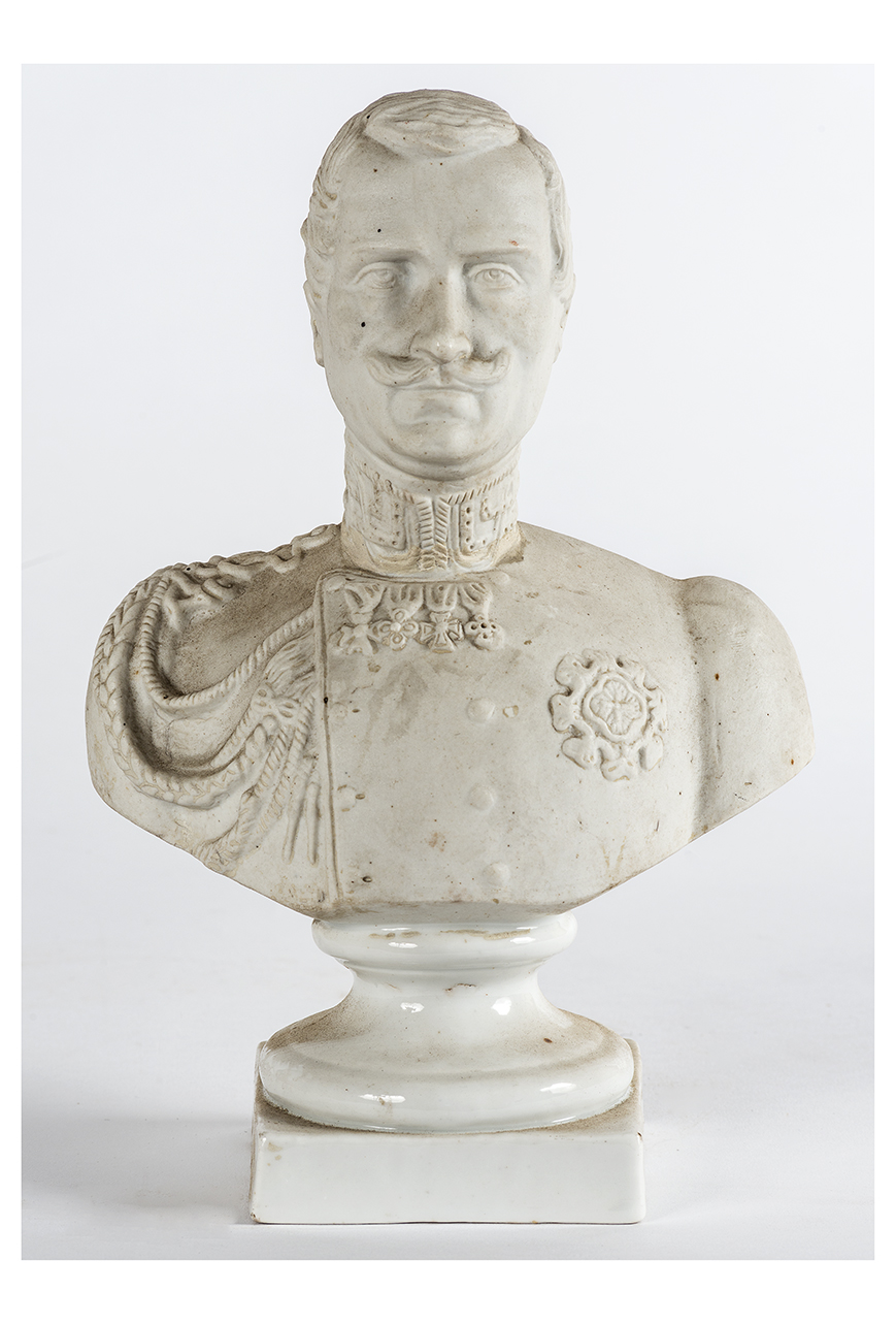 Personaggio maschile ritratto a mezzobusto, frontalmente. Porta i capelli corti e baffi sul viso. Indossa una divisa militare su cui sono appuntate alcune decorazioni, tra cui la placca dell'Ordine della Santissima Annunziata. Il bustino poggia su base a rocchetto a finale quadro