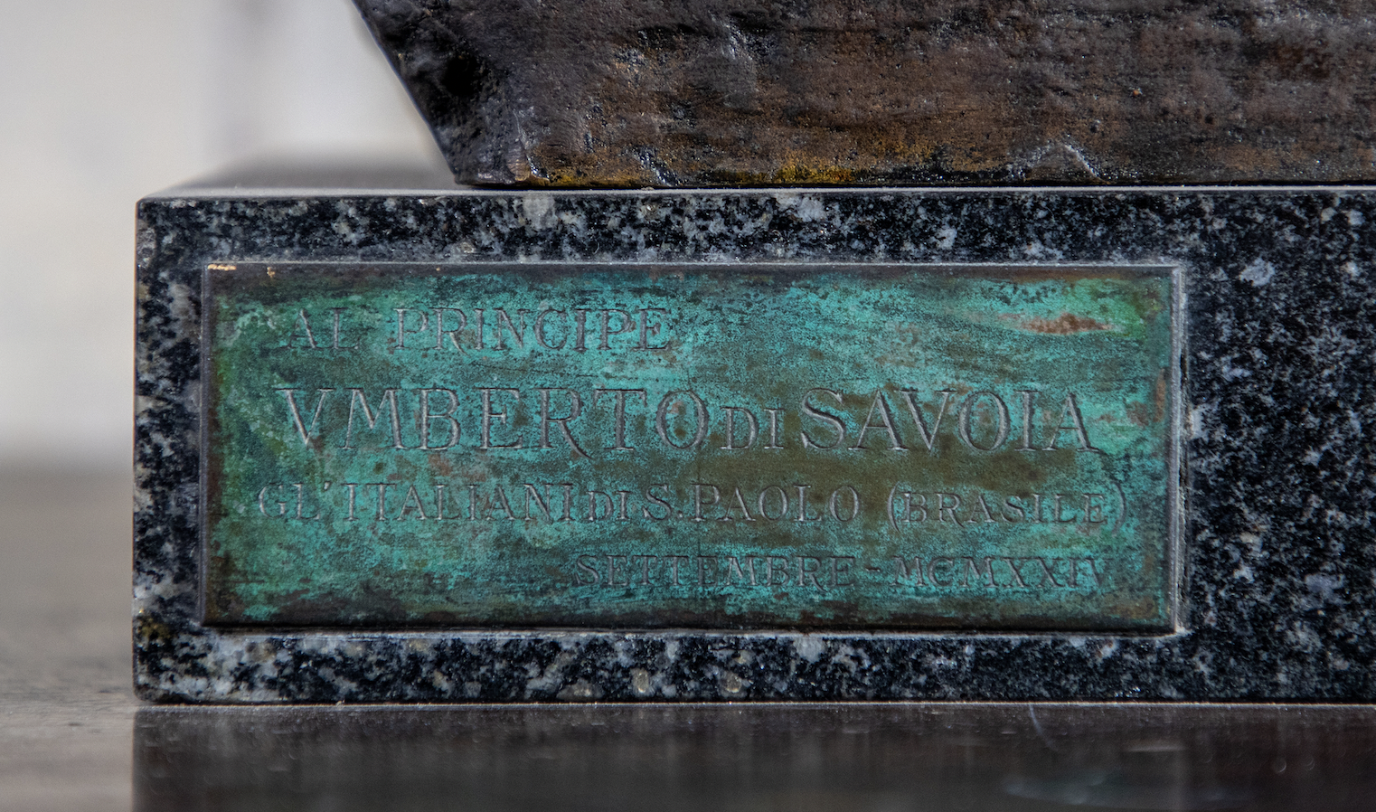 - ISCRIZIONI Due targhette posizionate sulla base in marmo della statua, lato destro e sinistro - AL PRINCIPE VMBERTO DI SAVOIA. GL’ITALIANI DI S. PAOLO (BRASILE). SETTEMBRE MCMXXIV - stampatello maiuscolo -