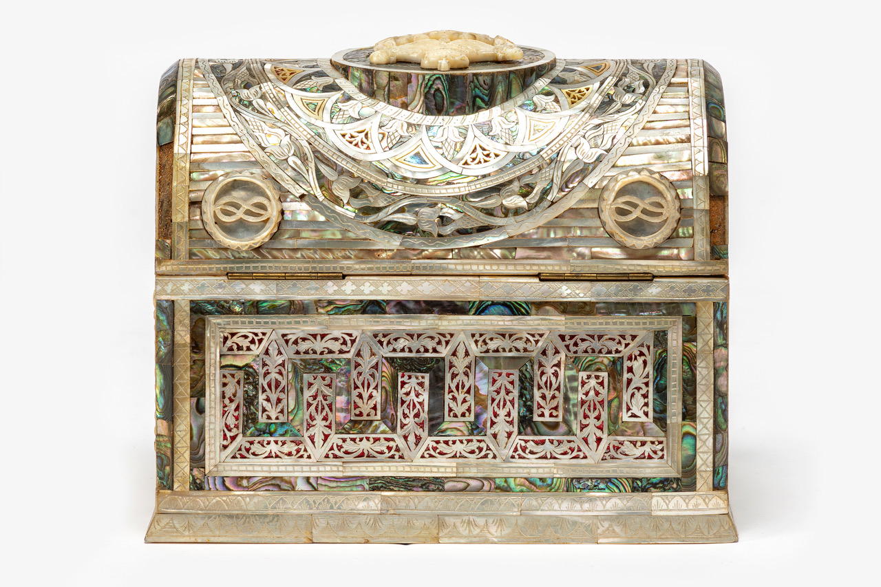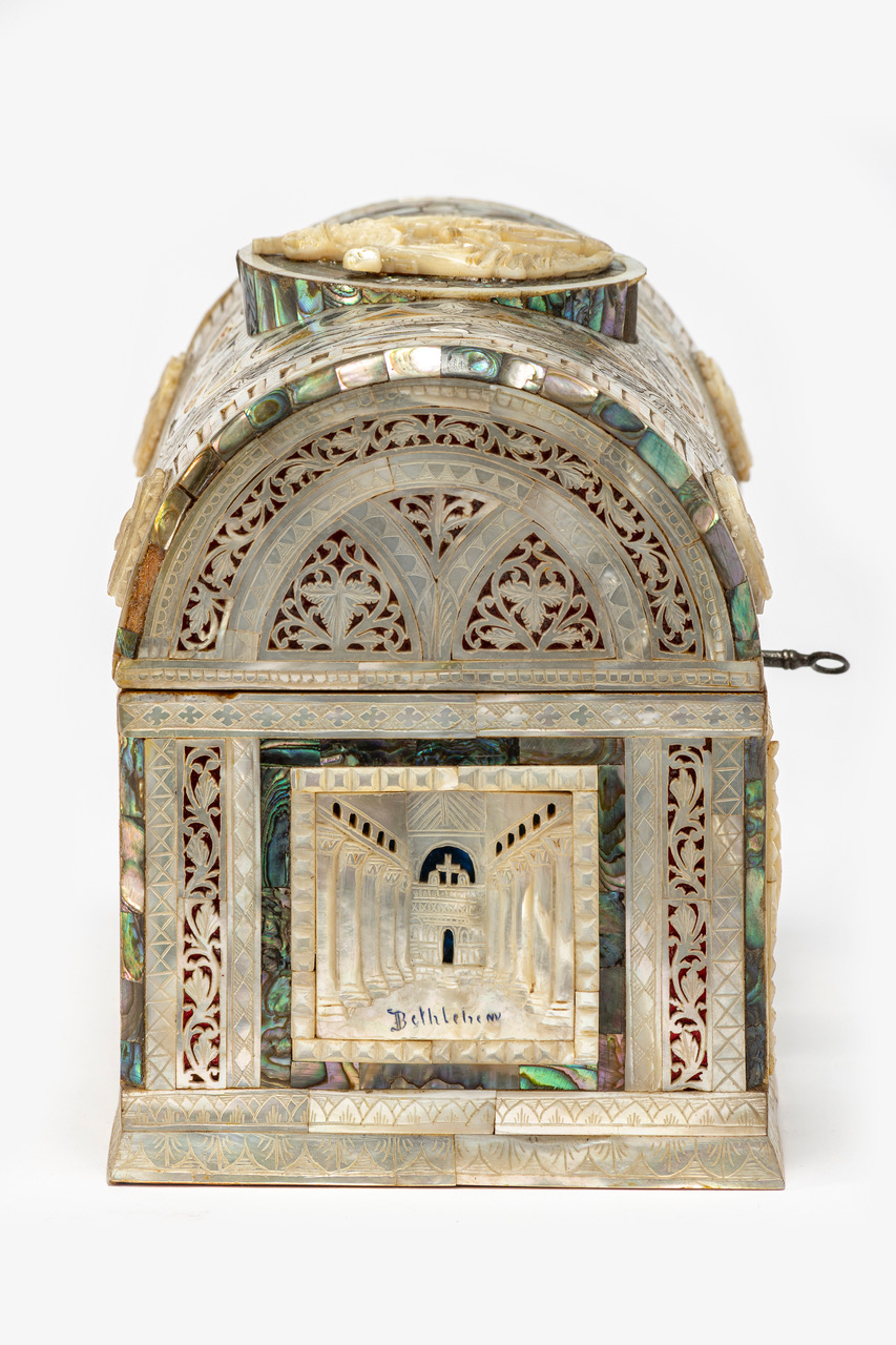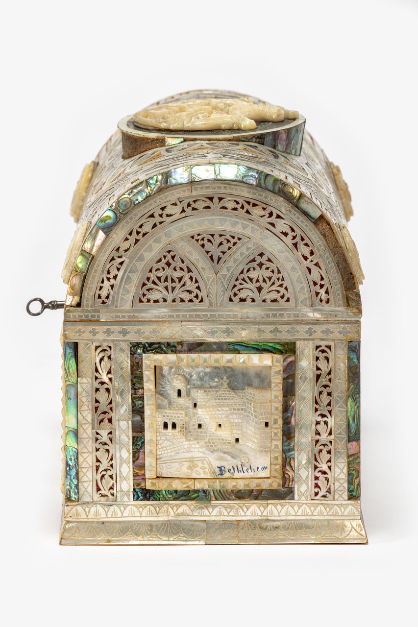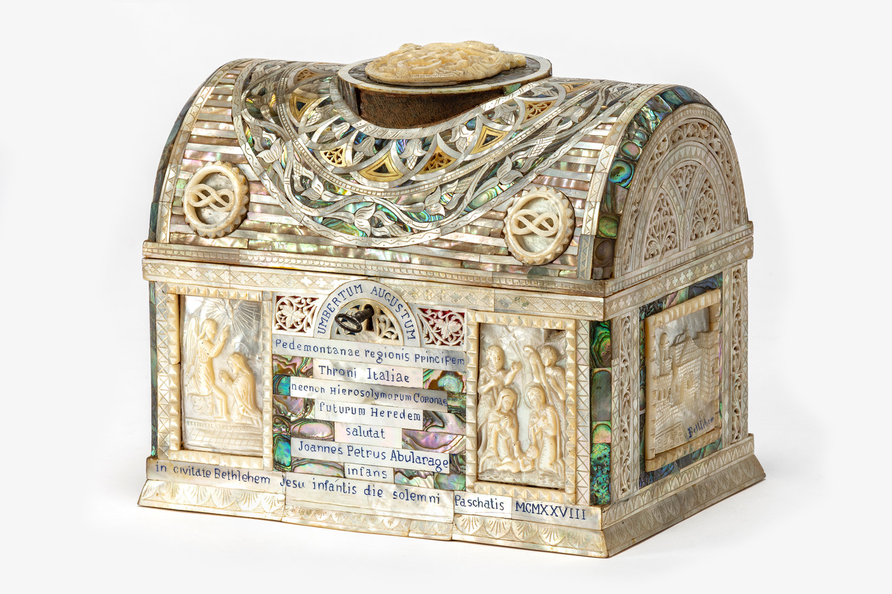 - NOTIZIE STORICO CRITICHE L’industria della madreperla ha origini molto antiche: nell’età del bronzo era già diffusa in Cina, India e nell’estremo oriente. In Medio Oriente se ne trovano tracce risalenti all’epoca degli antichi egizi, i quali raccoglievano la materia prima nel mar Rosso. Sin dal XIII secolo i facoltosi pellegrini cristiani che si recavano in Terra Santa erano soliti acquistare e portare con sé in patria dei souvenir, molti dei quali erano realizzati in madreperla. Dalla fine del XVII secolo poi, con la presenza dell’ordine di San Francesco d’Assisi a Gerusalemme e il conseguente maggiore afflusso di pellegrini, gli artefatti in madreperla acquisirono sempre più valore commerciale. La manifattura vide un considerevole sviluppo nel XIX e XX secolo, a seguito dell’aumento del flusso di turisti e pellegrini dovuto alla relativa stabilità delle relazioni tra il Medio Oriente e l’Europa. Se fino a quel momento questa forma d’arte era stata appannaggio di maestri provenienti in particolare da Genova e da Damasco, dal 1850 circa anche numerosi artigiani palestinesi aprirono le loro botteghe. Nei cento anni seguenti la lavorazione della madreperla si sviluppò considerevolmente e venne impiegata per produrre svariati tipi di artefatti: da semplici souvenir quali crocifissi, scatole e icone destinati ai turisti, a grandi opere realizzate su commissione per personaggi facoltosi. La lavorazione della madreperla assunse quindi un ruolo centrale nel mercato dell’arte turistica. Gli oggetti realizzati dai maestri intagliatori venivano acquistati dai pellegrini e dai turisti per commemorare la loro esperienza spirituale in Terra Santa, per portare a casa con sé una testimonianza tangibile del loro viaggio o come doni. Ancora oggi le guide turistiche annoverano i laboratori artigiani in cui si lavorano la madreperla e il legno di olivo tra le principali attrazioni della città della Terra Santa. In questo caso il cofanetto fu commissionato da Joannes Petrus Abularage come omaggio per Umberto II di Savoia in onore della sua visita in Terra Santa durante il periodo pasquale del 1928. L'opera fa parte di un corpus di oggetti extra-europei ricevuti in omaggio dai membri della famiglia reale di Savoia durante i loro viaggi, o offferti da delegazioni diplomatiche in visita in Italia. La consolidata tradizione di scambiarsi doni diplomatici tra monarchi, autorità religiose e capi di Stato è attestata sin dai tempi dell’antico Egitto e tutt’oggi risponde allo scopo di favorire, assicurare e mantenere buoni rapporti tra le parti. I doni, che assumono un valore, oltre che monetario, anche spiccatamente simbolico, sono spesso scelti in quanto rappresentanti l’essenza della Nazione o dell'istituzione religiosa che li offre. Si tratta infatti sovente di opere di artigianato, esempi di abilità manifatturiera, beni di lusso e artefatti di importanza storica realizzati con materiali locali. Attraverso l’esibizione di tali doni i dignitari promuovono la propria cultura e la propria patria ai livelli più alti delle pubbliche relazioni. Questo cofanetto in legno di olivo è preziosamente rivestito all'esterno da intarsi di madreperla che inquadrano, sul fronte, scene raffiguranti la Natività e l'Annunciazione. I lati presentano rispettivamente una veduta di Betlemme e della sua basilica. L'interno dello scrigno, ricoperto di velluto blu, contiene sei uova di cera decorate con l'immagine del Cristo risorto e con motivi floreali, vetri colorati e fili d'argento incastonati. Le uova, simbolo di rinascita, hanno sulla sommità nastri colorati. Lo stemma della famiglia reale italiana campeggia al centro del coperchio